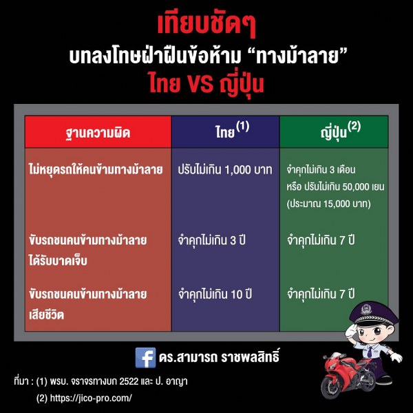 (3) ขับรถชนคนข้ามทางม้าลายเสียชีวิตบทลงโทษของไทยจะถูกจำคุกไม่เกิน 10 ปี และปรับไม่เกิน 200,000 บาท ในขณะที่ของญี่ปุ่นจะถูกจำคุกไม่เกิน 7 ปี หรือปรับไม่เกิน 1 ล้านเยน (ประมาณ 300,000 บาท)จากการเปรียบเทียบจะเห็นได้ว่าบทลงโทษของไทยมีทั้งที่รุนแรงน้อยกว่าและรุนแรงมากกว่าของญี่ปุ่น แต่ทำไมไทยจึงมีผู้เสียชีวิตจากอุบัติเหตุจราจรมากกว่าญี่ปุ่นมาก ? หรือ ทำไมญี่ปุ่นจึงมีผู้เสียชีวิตจากอุบัติเหตุจราจรน้อยกว่าไทยมาก ?
