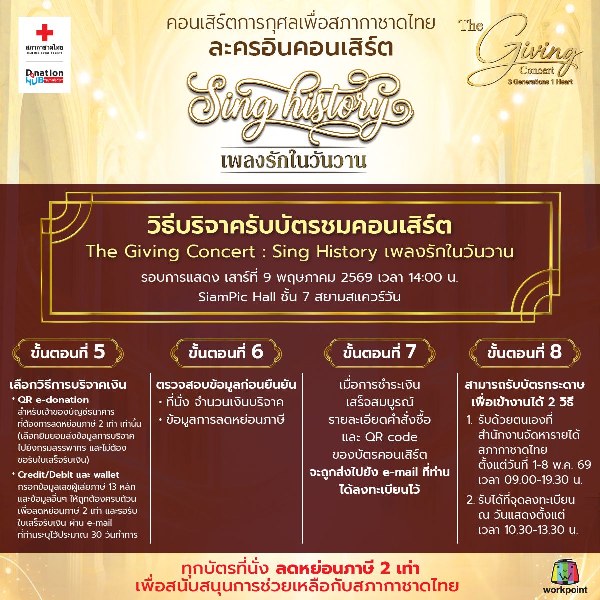 The Giving Concert ไม่ได้มอบเพียงความสุขผ่านบทเพลงอันไพเราะ หากยังเป็นอีกหนึ่งพลังสำคัญในการส่งต่อโอกาสและความช่วยเหลือเพื่อสนับสนุนภารกิจของสภากาชาดไทย ร่วมเป็นส่วนหนึ่งของการให้ที่มีความหมายผ่านบทเพลงอันไพเราะ ทุกที่นั่งคือเงินบริจาค พร้อมรับสิทธิลดหย่อนภาษี 2 เท่า บัตรบริจาคราคา 7,000 / 5,000 / 4,000 / 3,000 และ 2,000 บาท ได้บุญ ได้บัตร แล้ววันนี้ ที่ www.iredcross.org Line: @iredcross หรือ โทรศัพท์: 02 2564440 กด 7 มาร่วมร้อง ร่วมซึ้ง และร่วมส่งต่อการให้กับสภากาชาดไทยไปด้วยกัน