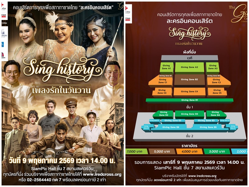 THE GIVING CONCERT ที่ 1 : Sing History เพลงรักในวันวาน คอนเสิร์ตที่ถ่ายทอดพลังแห่งการให้ในรูปแบบ Story Concert พาย้อนวันวานไปกับบทเพลงอันไพเราะจากภาพยนตร์และละครในความทรงจำ เชื่อมโยงเหตุการณ์สำคัญๆ ของสภากาชาดไทย ให้ทุกคนซาบซึ้งไปกับบทเพลงแห่งความทรงจำจาก โหมโรง เดอะมิวสิคัล, สุนทราภรณ์ เดอะมิวสิคัล, ทองกวาว เดอะมิวสิคัล และการแสดงของนักร้องคุณภาพบนเวทีเดียวกัน