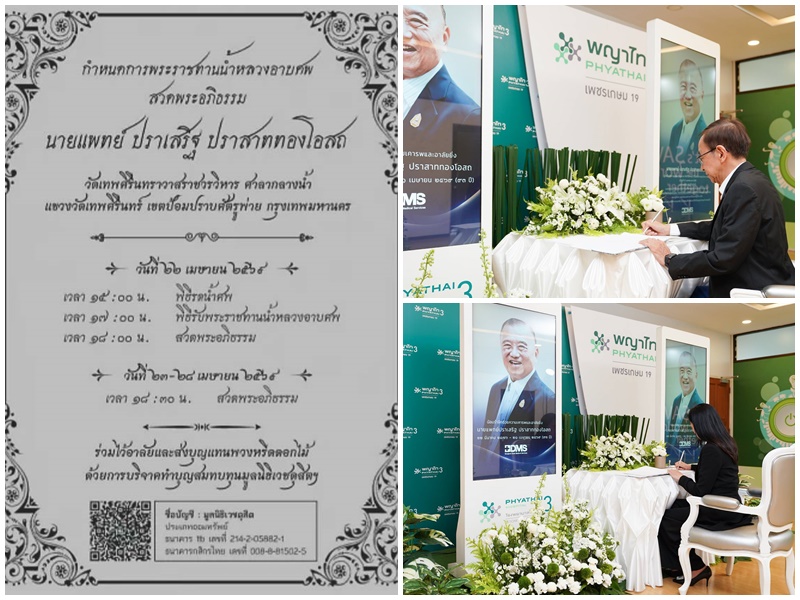 โรงพยาบาลพญาไท 3 ขอน้อมรำลึกด้วยความเคารพและอาลัยยิ่งต่อการจากไปของ นายแพทย์ ปราเสริฐ ปราสาททองโอสถ ผู้ก่อตั้งบริษัท กรุงเทพดุสิตเวชการ จำกัด (มหาชน) ได้ถึงแก่อนิจกรรมด้วยความสงบ สิริอายุ 93 ปี ณ โรงพยาบาลกรุงเทพ เมื่อวันที่ 21 เมษายน พ.ศ.2569