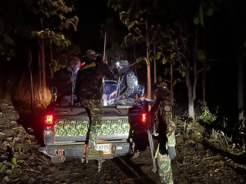 เจ้าหน้าที่ชุดสายตรวจปราบปรามส่วนกลาง ออกลาดตระเวนตั้งด่านตรวจคนลักลอบเผาป่าและล่าสัตว์ พื้นที่ป่าในเขตอุทยานแห่งชาติผาแดง