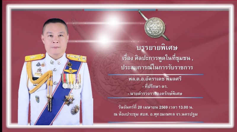 วันที่ 20 เม.ย.2569 เวลา 13.00-16.30 น. : พล.ต.อ.อัคราเดช พิมลศรี ที่ปรึกษา ตร. ได้รับเกียรติให้มาเป็นวิทยากรบรรยายพิเศษ ในหัวข้อ วิชาศิลปะการพูดกับประชาชน และ ประสบ การณ์ในการรับราชการ ให้แก่หลักสูตรประกาศนียบัตรด้านการสืบสวนสอบสวนคดีอาญารุ่นที่ 15 (นักเรียนนายร้อยตำรวจ รุ่น 79) จำนวน 281 นาย และหลักสูตรประกาศนียบัตรด้านการสืบสวนสอบสวนคดีอาญารุ่นพิเศษ รุ่นที่ 12 จำนวน 37 นาย ณ ห้องประชุมอเนกประสงค์ ชั้น 2 สถาบันส่งสำนักงานสอบสวน ต.ศาลายา อ.พุทธมณฑล จ.นครปฐม