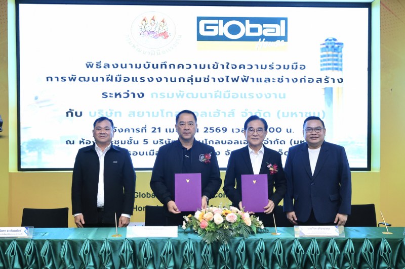 เมื่อวันที่ 21 เมษายน 2569 เวลา 10.00 น. นายสมาสภ์ ปัทมะสุคนธ์ อธิบดีกรมพัฒนาฝีมือแรงงาน ลงนามบันทึกความเข้าใจความร่วมมือการพัฒนาฝีมือแรงงานกลุ่มช่างไฟฟ้าและช่างก่อสร้าง ระหว่างกรมพัฒนาฝีมือแรงงาน กับนายวิทูร สุริยวนากุล ประธานเจ้าหน้าที่บริหาร บริษัท สยาม โกลบอลเฮ้าส์ จำกัด (มหาชน) พร้อมทั้งรับมอบสติ๊กเกอร์สัญลักษณ์ “ช่างไฟฟ้ามีใบเซอร์” จำนวน 1,000 แผ่น และเยี่ยมชมห้องสำหรับถ่ายทอดสดเพื่อส่งเสริมการจำหน่ายสินค้าออนไลน์ของบริษัท จำนวน 50 ห้อง โดยมี นายพัสกร จะเรียมพันธ์ ผู้อำนวยการสถาบันพัฒนาฝีมือแรงงาน 39 ร้อยเอ็ด นายเข็มชาติ สังฆะตาม รองประธานเจ้าหน้าที่บริหาร บริษัท สยาม โกลบอลเฮ้าส์ จำกัด (มหาชน) ร่วมเป็นสักขีพยาน คณะผู้บริหารของทั้งสองฝ่าย และผู้ผ่านการฝึกอบรม ร่วมเป็นเกียรติ ณ ห้องประชุม ชั้น 5 บริษัท สยาม โกลบอลเฮ้าส์ จำกัด (มหาชน) ตำบลรอบเมือง อำเภอเมือง จังหวัดร้อยเอ็ด
