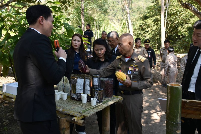 ช่วงบ่าย ไปเยี่ยมชมแปลงเกษตร ของนายสมชาติ กุนา เกษตรกรในพื้นที่โครงการร้อยใจรักษ์ ณ บ้านเมืองงามใต้ อำเภอแม่อาย ซึ่งเป็นแปลงริเริ่มทดสอบการปลูกโกโก้สายพันธุ์ im1 ซึ่งเป็นพืชระยะยาวปลูกใต้ร่มเงาไม้ใหญ่ร่วมกับพืชชนิดเดิม ทั้งยังมีราคาสูง นำไปแปรรูปเป็นผลิตภัณฑ์อื่น ๆ ได้หลากหลาย อาทิ ผงโกโก้ชงดื่ม และขนมช็อกโกแลต