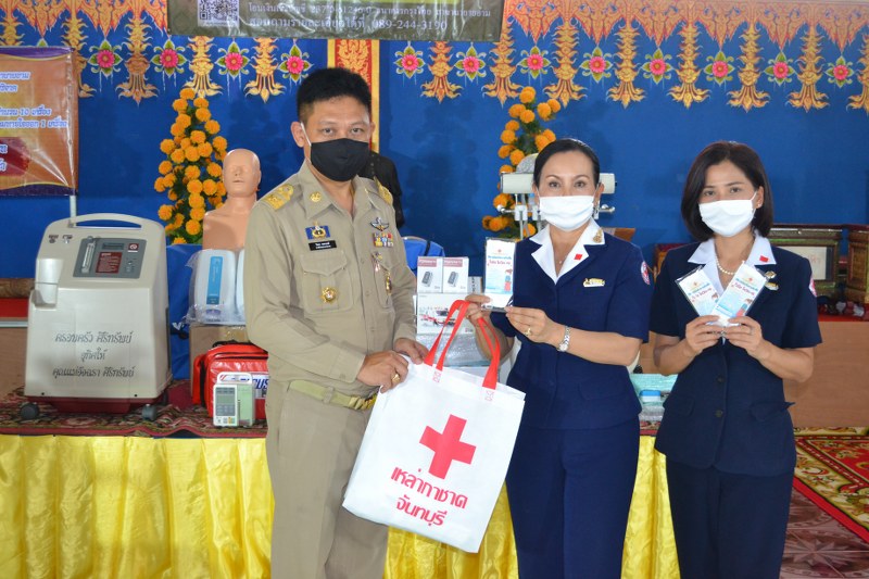 และโอกาสนี้ สำนักงานเหล่ากาชาดจังหวัดจันทบุรีได้แจกหน้ากากอนามัยแก่โรงพยาบาล ส่วนราชการ วัด พระภิกษุสงฆ์เพื่อป้องกันไวรัดโควิด-19