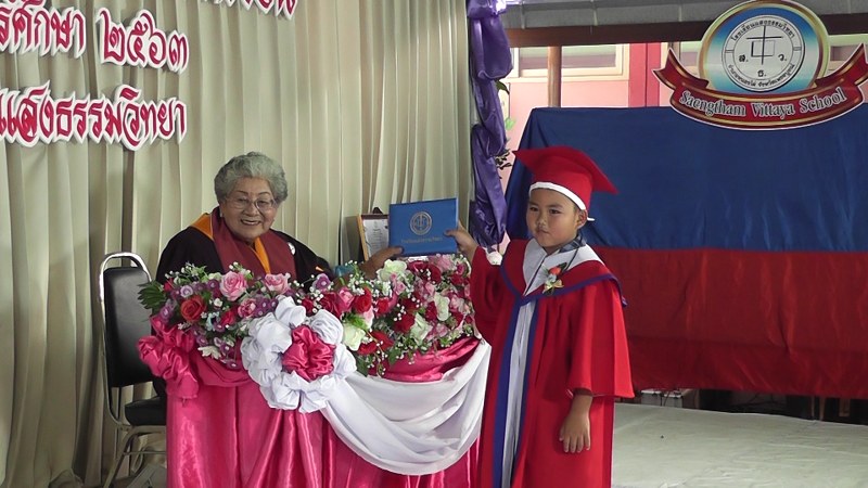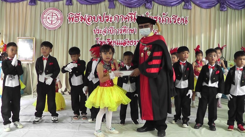 จากนั้น ประธานในพิธี พร้อมด้วย ผู้ช่วยศาสตราจารย์ดอกเตอร์ เสรี ธรรมอาสา ผู้อำนวยการโรงเรียนแสงธรรมวิทยา และ ศาสนาจารย์คุณหมอสายเรียม ธรรมอาสา ประธานบริหารโรงเรียนอนุบาลแสงธรรม ก็ได้ร่วมกันมอบประกาศนียบัตรให้แก่บัณฑิตน้อย ซึ่งมีนักเรียนสำเร็จการศึกษาหลักสูตรปฐมวัยปีที่ 3 จำนวน 16 คน และมอบวุฒิบัตรให้แก่นักเรียนชั้นประถมศึกษา ปีที่ 6 จำนวน 22 คน รวมนักเรียนที่จบการศึกษา ทั้งสิ้น 38 คน