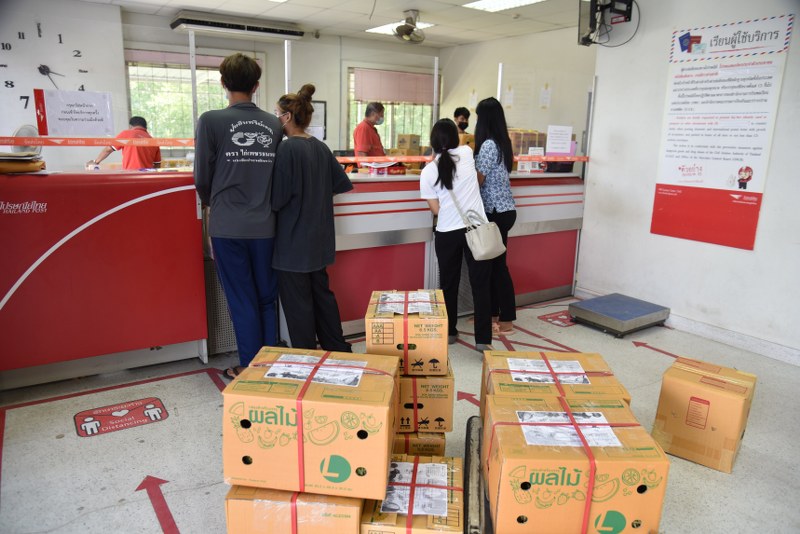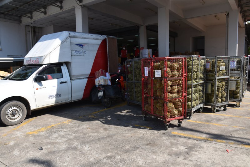 ที่ไปรษณีย์จันทบุรี เกษตรกรชาวสวนผลไม้ พ่อค้า แม่ค้า ประชาชนทั่วไป นักเรียน นักศึกษาที่หันมาขายสินค้าออนไลน์ เพิ่มช่องทางการตลาด หารายได้ลดผลกระทบในช่วงสถาน การณ์โควิด 19 ลดความเสี่ยงจากการขายตรง สัมผัสบุคคลทั่วไป ต่างพากันนำสินค้า ผลไม้ตามฤดูกาลของจังหวัดจันทบุรีที่กำลังให้ผลผลิต มาฝากไปรษณีย์จันทบุรีเพื่อส่งไปยังลูกค้าปลายทาง โดยเฉพาะทุเรียนมีการนำส่ง EMS ผ่านบริการ Roll Pallet ซึ่งเป็นตู้ตะแกรงเหล็กใส่สินค้า