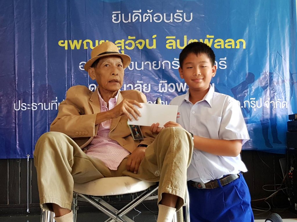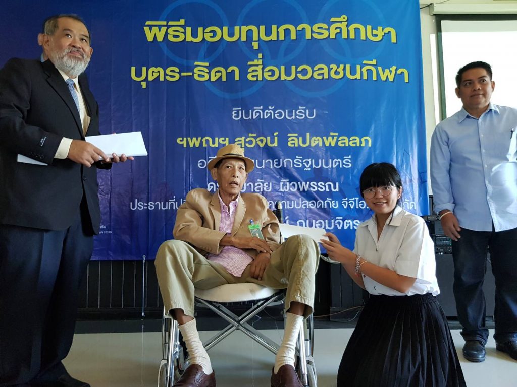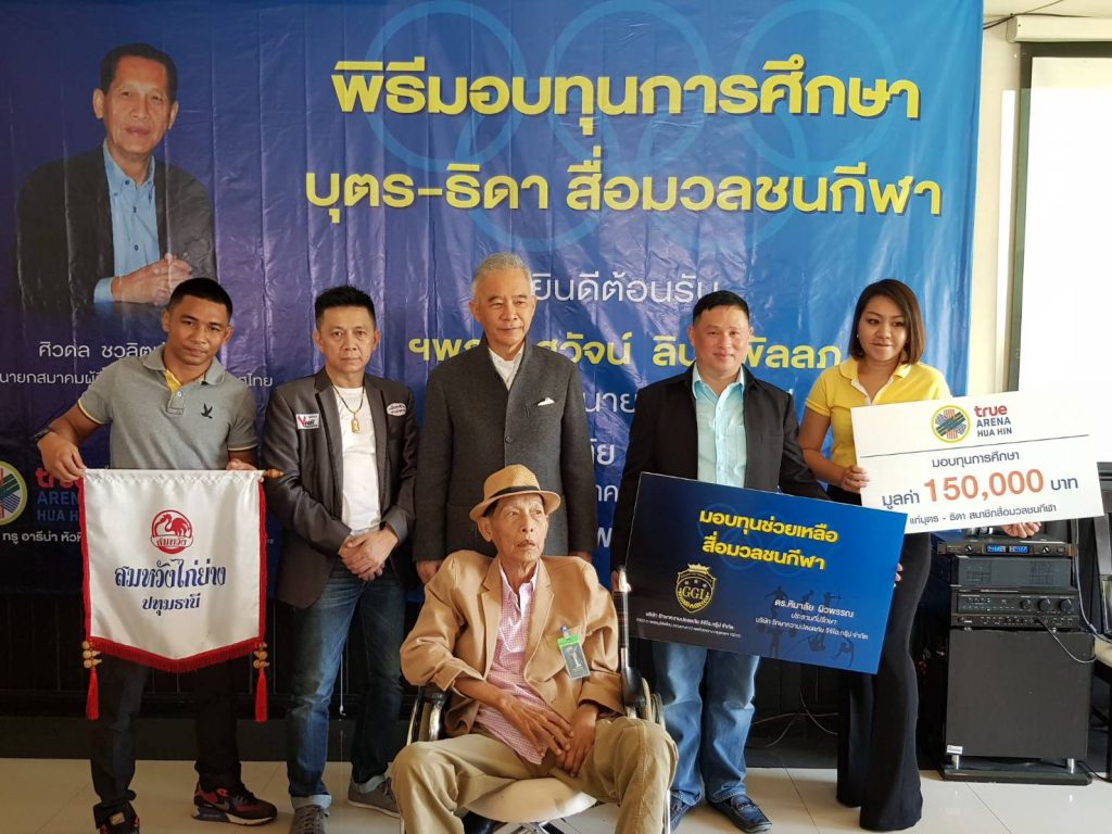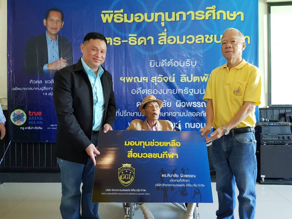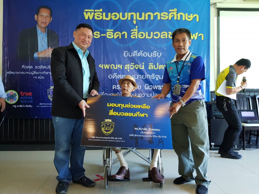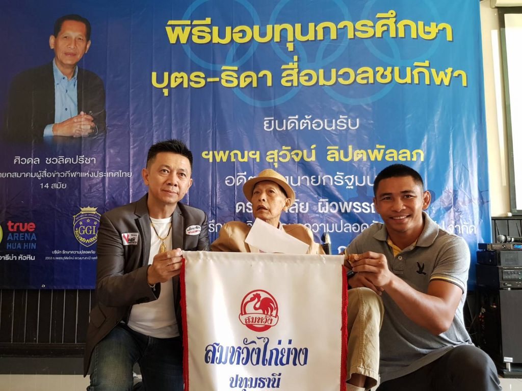 โดยมี นายสุวัจน์ ลิปตพัลลภ อดีตรองนายกรัฐมนตรี ให้เกียรติมาเป็นประธานพิธี พร้อมด้วย ดร.หิมาลัย ผิวพรรณ ประธานที่ปรึกษา บริษัท รักษาความปลอดภัย จีจีไอ.กรุ๊ป จำกัด และ พล.ต.ต.สุรพงษ์ ถนอมจิตร ผู้บังคับการตำรวจภูธรจังหวัดปทุมธานี รวมทั้ง นางพรศรี พิงค์สุวรรณ ผู้อำนวยการฝ่ายการตลาดประชาสัมพันธ์ และ พันธมิตรสัมพันธ์ บริษัท พราวด์ ฮอทพิทอลิตี้ จำกัด และนายฉลองกาญจน์ (อ๊อด) ผู้บริหารสมหวังไก่ย่าง ให้เกียรติเข้าร่วมพิธีมอบทุนดังกล่าว ซึ่งมี สื่อมวลชนสายกีฬาหลายสังกัด และ บุตร-ธิดา เข้าร่วมรับมอบทุนช่วยเหลือจำนวนทั้งหมด 57 ราย
