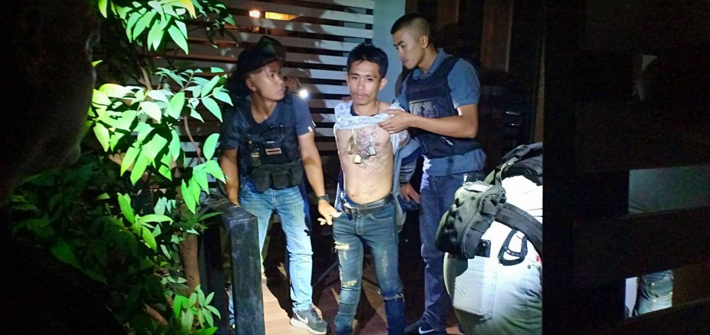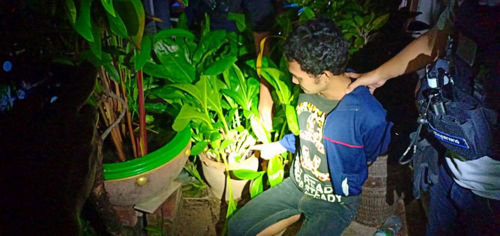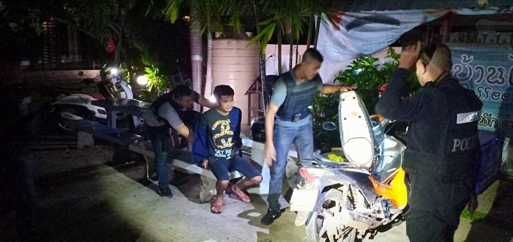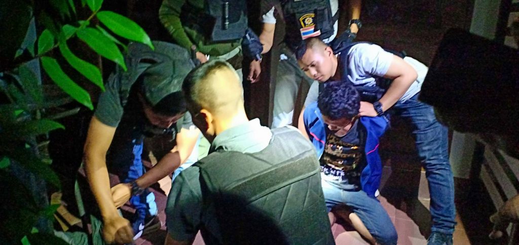 ซึ่งเจ้าหน้าที่ทำตัวเป็นนักเที่ยวรอดูอยู่ ได้พบชายวัยรุ่น 2 คนขับรถจักรยานยนต์ คันดังกล่าวช้อนท้ายกันเข้ามาภายในบริเวณรีสอร์ท แล้วมาจอดอยู่ที่กระถางต้นดอกไม้ แล้วนำห่อของบางอย่างซุกซ่อนไว้ในกระถางต้นไม้ ท่าทางมีพิรุธกำลังติดเครื่องรถเตรียมหนี เจ้าหน้าที่จึงแสดงตัวเข้าตรวจค้นตามร่างกายทั้ง 2ไม่พบสิ่งผิดกฎหมายใด ทราบชื่อนายชัชวาล (กุ้ง) ชาตรี อายุ 24 ปี ที่อยู่ บ้านเลขที่ 1 ต.นาทราย อ.เมือง จ.นครพนม ซึ่งเป็นคนขับรถส่วนชายที่นั่งช้อนคือ นายณรงฤทธิ์ (ต้า) โคตะสิน