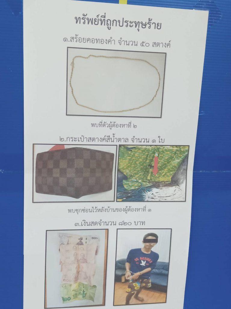 ซึ่งทางเจ้าหน้าที่ชุดสืบสวน สภ.แหลมฉบัง เร่งสืบสวนติดคนร้าย จนสามารถจับกุมตัวได้พร้อมของกลาง เป็นทรัพย์สินที่ชิงมา และอาวุธ ที่ใช้ก่อเหตุ ได้ทั้ง 2คนในช่วงบ่ายๆของวันเดียวกัน โดยการสอบสวนผู้ต้องให้การรับสารภาพ ว่า ก่อเหตุจริง เพราะโกรธแค้น ที่เข้าไปขอเงินไม่ได้แถมถูกพูด ดูถูกอีก โดยผู้ต้องหานำทรัพย์สินที่ได้บางส่วนนำไปใช้จ่ายและซื้อยาเสพติดมาเสพ ซึ่งทางเจ้าหน้าที่ทำการตรวจปัสสาวะพบเป็นสีม่วง ซึ่งมีสารเสพติดอีกด้วย