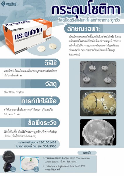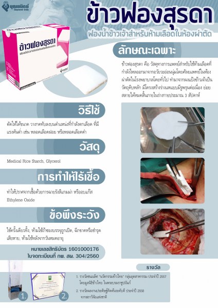 ซึ่งสามารถดำเนินการประดิษฐ์คิดค้นได้ภายในประเทศไทย ด้วยฐานความรู้ความเป็นไทย โดยนักวิทยาศาสตร์ไทย สร้างสรรค์เป็นเครื่องมือแพทย์ตามเกณฑ์การแพทย์ที่ได้มาตรฐานตามกำหนดขององค์กรผลิตเครื่องมือแพทย์นานาชาติ รับประกันจากกองควบคุมเครื่องมือแพทย์ สำนักงานคณะกรรมการอาหารและยา กระทรวงสาธารณสุขไทย ว่ามีความน่าเชื่อถือ ถูกต้อง ปลอดภัย ต่อผู้ป่วยและมีประสิทธิภาพเชิงการใช้งานจริง อีกทั้งมีคุณภาพที่ดีขึ้น และราคาถูกลง เมื่อเทียบกับสินค้าชนิดเดียวกันจากต่างประเทศ ซึ่งวัสดุห้ามเลือดชนิดฟองน้ำ ประเทศไทยมีสถิติการใช้งาน ประมาณ 200,000 ชิ้นต่อปี ทั้งหมดต้องนำเข้าจากต่างประเทศ ชิ้นละประมาณ 400 บาท มีมูลค่ารวม 80 ล้านบาทต่อปี ส่วนฟองน้ำข้าวเจ้าห้ามเลือดของไทย มีราคาชิ้นละ 200 บาท สามารถลดการขาดดุล 40 ล้านบาทต่อปี ส่วนกระดุมยึดตรึงกะโหลก