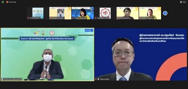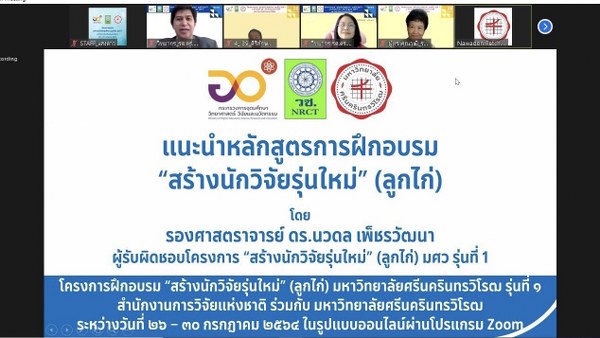 เมื่อวันที่ 26 กรกฎาคม พ.ศ. 2564 : สำนักงานการวิจัยแห่งชาติ (วช.) และ มหาวิทยาลัยศรีนครินทรวิโรฒ ได้ร่วมกันจัดโครงการฝึกอบรม “สร้างนักวิจัยรุ่นใหม่” (ลูกไก่) ในรูปแบบออนไลน์ ผ่านระบบประชุมทางไกล (Video Conference) ในระหว่าง วันที่ 26-30 กรกฎาคม 2564 โดยมี นายสมปรารถนา สุขทวี รองผู้อำนวยการสำนักงานการวิจัยแห่งชาติ ให้เกียรติเป็นประธานในพิธีเปิดโครงการ และ ผศ.ดร.ปฐมทัศน์ จิระเดชะ ผู้อำนวยการสถาบันยุทธศาสตร์ทางปัญญาและวิจัย มหาวิทยาลัยศรีนครินทรวิโรฒ ให้เกียรติกล่าวต้อนรับผู้เข้าร่วมอบรม วิทยากร (แม่ไก่) และผู้ทรงคุณวุฒิทุกท่าน