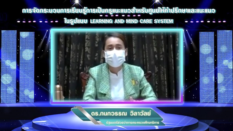 เมื่อวันที่ 27 สิงหาคม 2564 : ดร.กนกวรรณ วิลาวัลย์ รัฐมนตรีช่วยว่าการกระทรวงศึกษาธิการ เป็นประธานในพิธีเปิดการอบรม “การจัดกระบวนการเรียนรู้เพื่อการแนะแนวและการให้คำปรึกษา สำหรับศูนย์ให้คำปรึกษา (กศน.) ในรูปแบบ Learning and Mind Care Center” ผ่านระบบการประชุมออนไลน์ (ZOOM Cloud Meetings) ซึ่งการอบรมจัดขึ้นระหว่าง วันที่ 30 สิงหาคม 2564-15 กันยายน 2564 โดยใช้หลักสูตร “ต้นทุนชีวิต” และทีมวิทยากรผู้ทรงคุณวุฒิ จากศูนย์คุณธรรม (องค์การมหาชน) ในสังกัดกระทรวงวัฒนธรรม ร่วมกับผู้ที่เข้ารับการอบรมในครั้งนี้ซึ่ง เป็นครู (กศน.) ที่รับผิดชอบดูแลศูนย์ให้คำปรึกษา จากสถานศึกษาในสังกัด (กศน.) ทั่วประเทศ จำนวน 77 คน