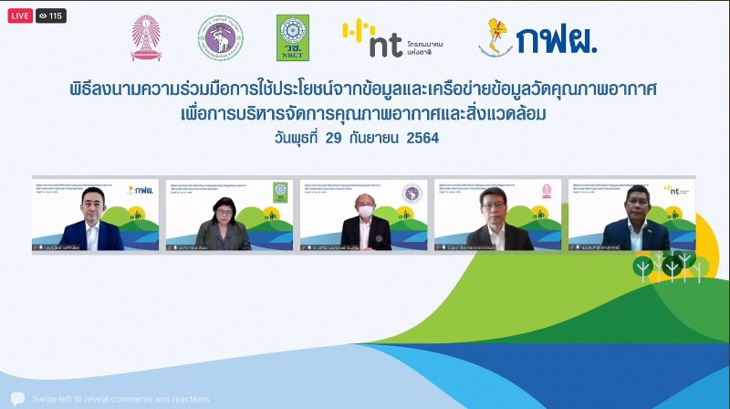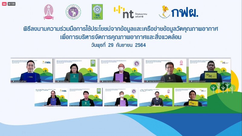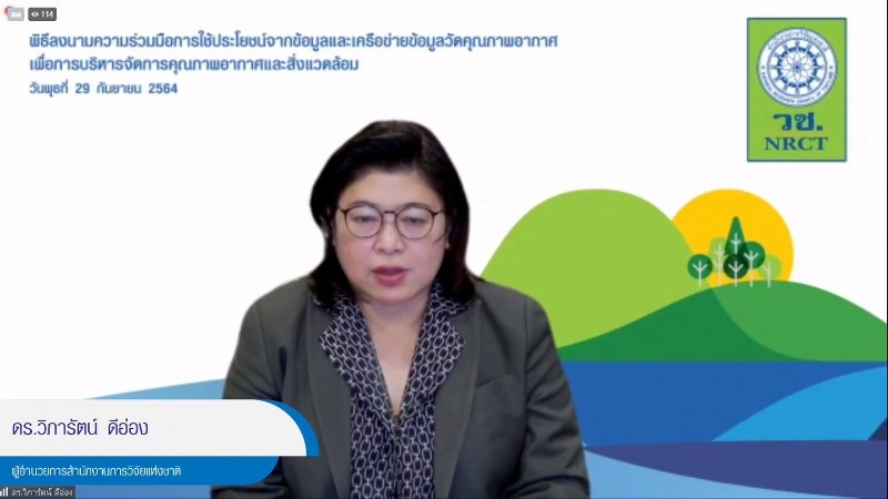 ดร.วิภารัตน์ ดีอ่อง ผู้อำนวยการสำนักงานการวิจัยแห่งชาติ สำนักงานการวิจัยแห่งชาติ (วช.) ร่วมกับ นายบุญญนิตย์ วงศ์รักมิตร ผู้ว่าการการไฟฟ้าฝ่ายผลิตแห่งประเทศไทย (กฟผ.), ศาสตราจารย์ ดร.สุพจน์ เตชวรสินสกุล คณบดีคณะวิศวกรรมศาสตร์ จุฬาลงกรณ์มหาวิทยาลัย, ศาสตราจารย์คลินิก นายแพทย์นิเวศน์ นันทจิต อธิการบดีมหาวิทยาลัยเชียงใหม่ และนาวาอากาศเอก สมศักดิ์ ขาวสุวรรณ์ กรรมการบริษัท โทรคมนาคมแห่งชาติ จำกัด (มหาชน) รักษาการกรรมการผู้จัดการใหญ่ ร่วมลงนามในบันทึกข้อตกลงความร่วมมือ ว่าด้วยความร่วมมือในการใช้ประโยชน์จากข้อมูลและขยายเครือข่ายข้อมูลตรวจวัดคุณภาพอากาศ เพื่อการบริหารจัดการคุณภาพอากาศและสิ่งแวดล้อม โดยมีผู้บริหารระดับสูงจากทั้ง 5 หน่วยงาน ร่วมเป็นพยาน