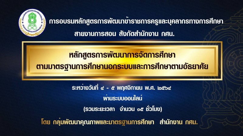 สำหรับ “หลักสูตรการพัฒนาการจัดการศึกษาตามมาตรฐานการศึกษานอกระบบและการศึกษาตามอัธยาศัย” นั้นเป็นหลักสูตรหนึ่งที่สำนักงาน กศน. โดยกลุ่มพัฒนาคุณภาพและมาตรฐานการศึกษา พัฒนาและจัดทำขึ้น เพื่อใช้เป็นหลักสูตรในการพัฒนาข้าราชการครูและบุคลากรทางการศึกษา สายการสอน สังกัดสำนักงาน กศน.ตามประกาศสำนักงานส่งเสริมการศึกษานอกระบบและการศึกษาตามอัธยาศัย เรื่อง การรับรองหลักสูตรการพัฒนาข้าราชการครูและบุคลากรทางการศึกษา สายการสอน สังกัดสำนักงาน กศน. (เพิ่มเติม) ประกาศ ณ วันที่ 8 มีนาคม พ.ศ. 2564 โดยการอบรม “หลักสูตรการพัฒนาการจัดการศึกษาตามมาตรฐานการศึกษานอกระบบและการศึกษาตามอัธยาศัย” ในครั้งนี้ จัดขึ้นระหว่างวันที่ 4 – 5 พฤศจิกายน 2564 ผ่านระบบออนไลน์ (Google meet)