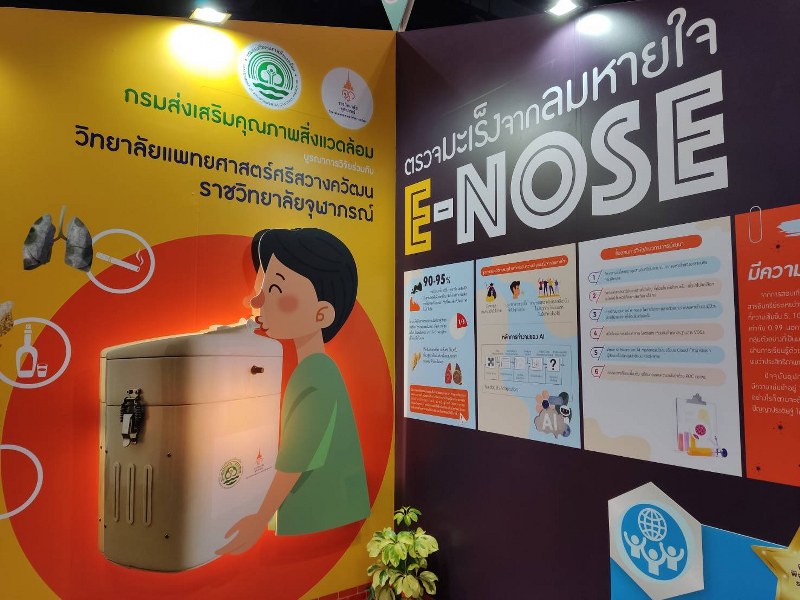 ดร.วรรณา เลาวกุล หัวหน้าคณะวิจัยจากกรมส่งเสริมคุณภาพสิ่งแวดล้อม กล่าวว่า การวิจัยได้ร่วมกับวิทยาลัยแพทยศาสตร์ศรีสวางควัฒน ราชวิทยาลัยจุฬาภรณ์ คิดค้นและพัฒนานวัตกรรมอุปกรณ์ประเมินความเสี่ยงมะเร็งจากลมหายใจ เป็นการยกระดับและเพิ่มประสิทธิภาพในการประเมินความเสี่ยงมะเร็งของประเทศไทยได้เป็นอย่างดี โดยนวัตกรรมดังกล่าว มีคุณสมบัติใช้งานง่าย เพียงเป่าลมหายใจเข้าไปในเครื่อง ใช้เวลาประมวลผลเพียง 20 วินาที สามารถประเมินผลออกมาเป็นเปอร์เซ็นต์ ว่ามีแนวโน้มควรเข้ารับการรักษาโรคมะเร็งหรือไม่ ปัจจุบันทดสอบการใช้งานนวัตกรรมฯ กับผู้ป่วยมะเร็งปอดและกลุ่มคนปกติในโรงพยาบาลจุฬาภรณ์ พบว่า ประสิทธิภาพของนวัตกรรม มีความแม่นยำถึง 70% ในอนาคตจะพัฒนาต่อยอดนวัตกรรม นำไปขยายผลประเมินความเสี่ยงของประชาชนผู้ได้รับหรือสัมผัสสารมลพิษทางอากาศ เช่น พื้นที่ปัญหาหมอกควัน เป็นต้น หากภาคเอกชนที่สนใจสามารถร่วมบูรณาการพัฒนาอุปกรณ์ประเมินความเสี่ยงมะเร็งสู่เชิงพาณิชย์ต่อไป