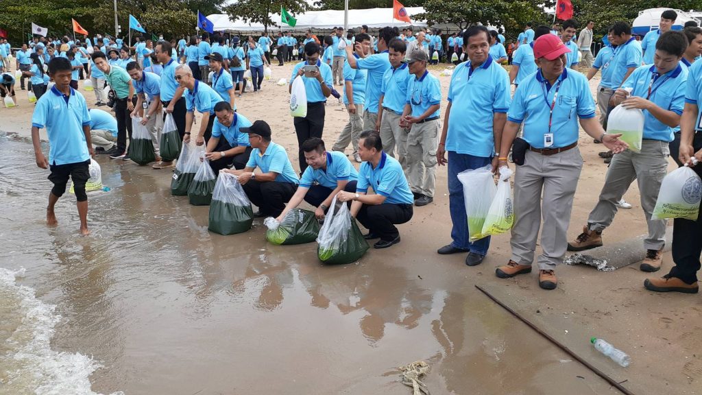 นายชัยยศ กล่าวเพิ่มเติมว่า ปตท. นอกจากจะร่วมกับชุมชนในเขตเทศบาลนครแหลมฉบังแล้ว ยังมีหน่วยงานราชการและเครือข่ายในจังหวัดชลบุรีให้การสนับสนุนเข้าร่วมกิจกรรมด้วย อาทิ กลุ่มประมง สำนักงานทรัพยากรธรรมชาติและสิ่งแวดล้อมจังหวัดชลบุรี สำนักงานสิ่งแวดล้อมภาคที่ 13 ชลบุรี สถานีพัฒนาทรัพยากรป่าชายเลนที่ 5 ชลบุรี ประมงจังหวัดชลบุรี ประมงอำเภอศรีราชา อุตสาหกรรมจังหวัดชลบุรี สำนักงานนิคมอุตสาหกรรมแหลมฉบัง การท่าเรือแหลมฉบัง ชมรมอาสาสมัครพิทักษ์สิ่งแวดล้อม โรงเรียนวัดแหลมฉบัง และภาคเอกชนในพื้นที่ โดยจะปล่อยพันธ์สัตว์น้ำ รวมจำนวน 2,010,000 ตัว แบ่งเป็น ลูกปลากระพงขาว 10,000 ตัว ลูกกุ้งแชบ๋วย 1,000,000 ตัว และลูกปู 1,000,000 ตัว ทั้งนี้ได้ประสานงานกับหน่วยงานที่เกี่ยวข้องเพาะพันธุ์สัตว์น้ำที่มีขนาดเหมาะสม ปล่อยลงทั้งบริเวณชายหาดและกลางทะเล เพื่อให้สัตว์น้ำสามารถดำรงชีวิตอยู่ได้ตามธรรมชาติ