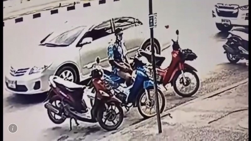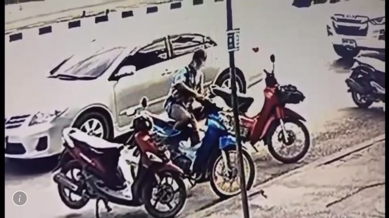 นครนายก – กล้องวงจรปิดจับภาพคนร้ายเป็นชาย สวมหมวกแก็ป เดินเข้าใกล้รถจยย.สีแดงแล้วขึ้นคร่อม ใช้อุปกรณ์ที่เตรียมมาไขไปที่รูกุญแจรถแต่ไม่สำเร็จ ก่อนเดินวนกลับมาไขรูกุญแจรถสีน้ำเงินได้ ก่อนรีบขับหลบหนีไป