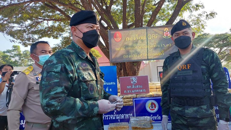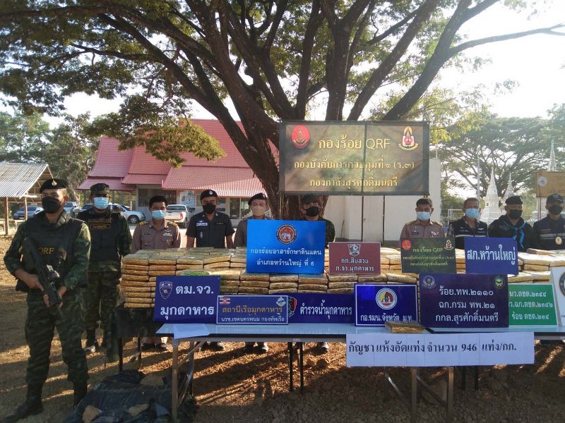 มุกดาหาร – ทหาร กกล.สุรศักดิ์มนตรี บก.ควบคุมที่ 1 ร.3 สนธิกำลังหน่วยความมั่นคงในพื้นที่ ตรวจยึดกัญชาแห้งอัดแท่งจำนวน 22 กระสอบ รวมน้ำหนัก 946 แท่ง/กก. มูลค่า 2 ล้านบาท ที่ริมฝั่งแม่น้ำโขงลักลอบนำเข้าจากประเทศเพื่อนบ้าน ส่วนผู้ต้องหาหลบหนีไปได้