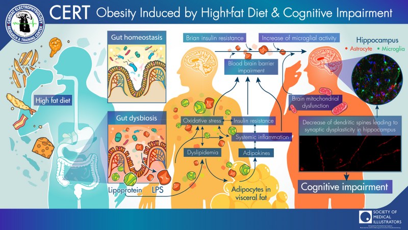 จากการศึกษาโครงการวิจัยนี้ ผ่านสัตว์ทดลองที่มีลักษณะคล้ายภาวะอ้วนลงพุงในคน ผ่านการบริโภคอาหารไขมันสูงแบบเรื้อรัง พบว่าสัตว์ทดลองที่มีการบริโภคอาหารไขมัน เป็นเวลานาน ทำให้เกิดความผิดปกติของการเผาผลาญอาหาร ภาวะอ้วนที่มีการดื้อต่ออินซูลิน ซึ่งมีความผิดปกติของการทำงานในสมอง ส่งผลให้การเรียนรู้และความจำลดลง นอกจากนี้ ยังมีการเปลี่ยนแปลงของปริมาณและชนิดแบคทีเรียในลำไส้ เกิดขึ้นในระยะแรกของการบริโภคอาหารไขมัน ตามมาด้วยความผิดปกติในเลือดเช่น ไขมันสูง ภาวะดื้อต่ออินซูลิน และสุดท้ายเกิดการเปลี่ยนแปลงในสมอง ซึ่งนำไปสู่การลดลงของการเรียนรู้และความจำในโรคอ้วนลงพุง ดังนั้นการลดภาวะดื้อต่ออินซูลิน การลดไขมันในเลือด หรือ การลดภาวะการเสียสมดุลของแบคทีเรียในลำไส้ ควรจะให้ผลประโยชน์ในการป้องกันการทำงานที่ผิดปกติของสมอง และการบกพร่องของการเรียนรู้และความจำ ในสภาวะภาวะอ้วนลงพุง