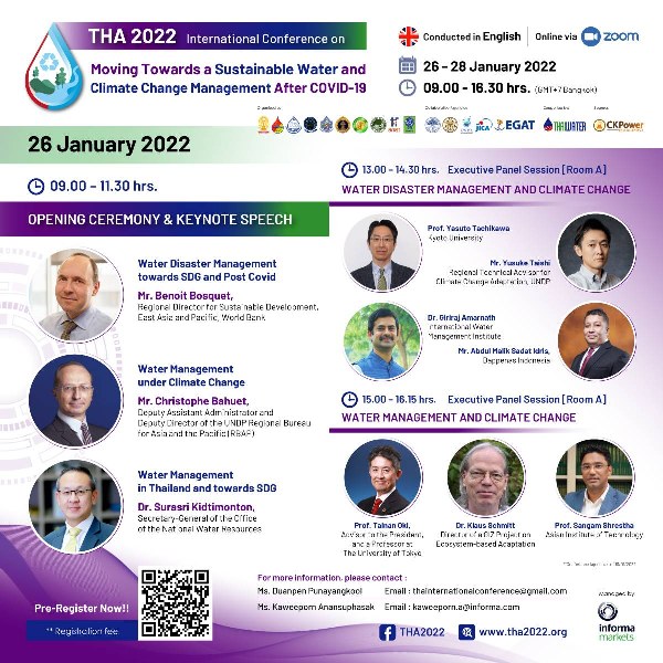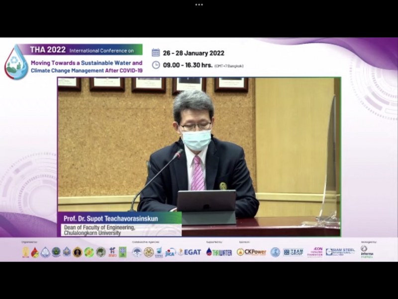 จุฬาลงกรณ์มหาวิทยาลัย ร่วมกับ สมาคมนักอุทกวิทยาไทย, กรมชลประทาน, สำนักงานทรัพยากรน้ำแห่งชาติ, กรมทรัพยากรน้ำ, กรมทรัพยากรน้ำบาดาล, คณะวิศวกรรมศาสตร์ กำแพงแสน มหาวิทยาลัยเกษตรศาสตร์, สถาบันเทคโนโลยีแห่งเอเซีย สำนักงานคณะกรรมการส่งเสริมวิทยาศาสตร์ วิจัยและนวัตกรรม และ สำนักงานการวิจัยแห่งชาติ จัดการประชุมนานาชาติในหัวข้อ “THA 2022 International Conference on Moving Towards a Sustainable Water and Climate Change Management After COVID-19” ในรูปแบบออนไลน์ ผ่าน Zoom Meeting ระหว่างวันที่ 26- 28 มกราคม 2565