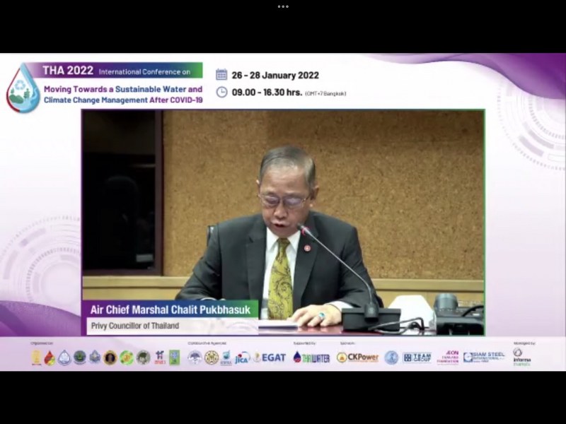 โดยในวันนี้ วันที่ 26 มกราคม 2565 : พลอากาศเอกชลิต พุกผาสุข องคมนตรี กล่าวปาฐกถาพิเศษ เปิดงาน พร้อมกล่าวว่า การบริหารจัดการน้ำอย่างยั่งยืน ตามโครงการพระราชดำริ ต้องการที่ให้ประชาชนมีน้ำไว้ใช้ ยกตัวอย่างเช่น อ่างเก็บน้ำนฤบดินทรจินดา (ห้วยโสมงอันเนื่องมาจากพระราชดำริ) ต.แก่งดินสอ อ.นาดี จ.ปราจีนบุรี ซึ่งเป็นอ่างเก็บน้ำอันเนื่องมาจากพระราชดำริ ตั้งแต่สมัยรัชกาลที่ 9 และ พระบาทสมเด็จพระเจ้าอยู่หัว รัชกาลที่ 10 ดำเนินการสืบสานต่อยอด ซึ่งโครงการนี้ พื้นที่โดยรอบเขื่อนมีความชุ่มชื่นอย่างมาก พื้นที่ป่าของกรมอุทยาน และป่าไม้ มีความอุดมสมบูรณ์ผิดกับอดีตที่อ่างเก็บน้ำนี้มีความแห้งแล้งเป็นอย่างมาก พร้อมย้ำว่า หลายโครงการในพระราชดำริ พระบาทสมเด็จพระเจ้าอยู่หัวรัชกาลที่ 10 ได้ตั้งคณะกรรมการขับเคลื่อนงานมาติดตามงาน และเดินหน้าบางโครงการ ใช้พื้นที่ดินป่าไม้ เขตอุทยานให้เป็นประโยชน์กับคนไทยให้มากที่สุด พร้อมระบุว่า “อยากให้หน่วยงานในประเทศไทย ที่เกี่ยวข้องเรื่องระบบน้ำ ทำเพื่อประชาชน และใช้ข้อมูลในเวทีนำมาสร้างประโยชน์แก้ปัญหาเรื่องน้ำ”