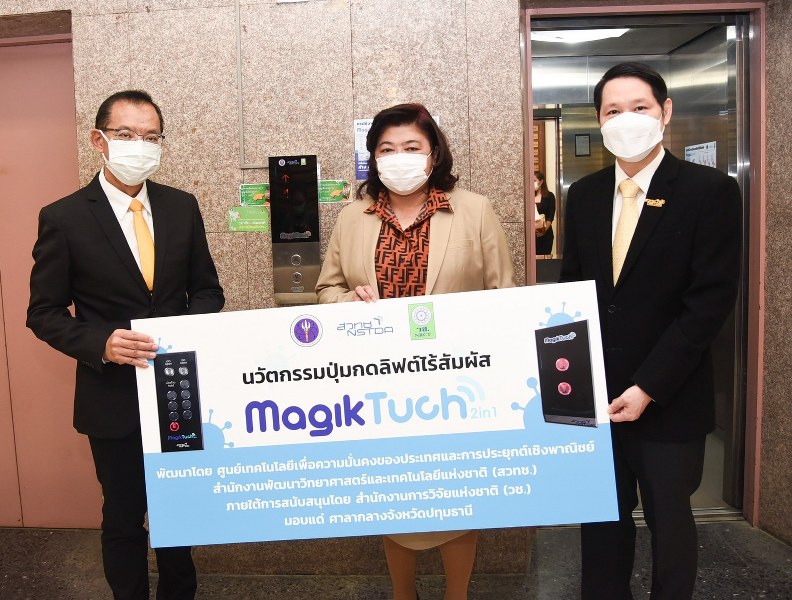 ดร.วิภารัตน์ ดีอ่อง ผู้อำนวยการสำนักงานการวิจัยแห่งชาติ (วช.) กล่าวว่า จากที่ผ่านมาประเทศไทยต้องเผชิญกับวิกฤติโควิด-19 สำนักงานการวิจัยแห่งชาติ (วช.) ภายใต้กระทรวง (อว.) ได้มีส่วนร่วมในการคลี่คลายสถานการณ์โควิด-19 โดย การวิจัยและพัฒนานวัตกรรมเพื่อแก้ปัญหาและรับมือกับสถานการณ์การระบาดของโรคโควิด-19 (วช.) ได้มุ่งเน้นผลงานเชิงสุขภาพให้มีความหลากหลายตามสถานการณ์ที่เกิดขึ้นจริงโดยผลงานนวัตกรรม “MagikTuch” ปุ่มกดลิฟต์ไร้สัมผัส แบบ 2 in 1 ถือเป็นหนึ่งในผลงาน ที่ (วช.) ให้การสนับสนุนนักวิจัย สวทช. เพื่อขยายผลสู่การใช้งานจริงเพื่อบรรเทาวิกฤตการระบาดของโรคโควิด-19 ในประเทศ ด้วยการแปลงระบบลิฟต์ทั่วไปให้เป็นลิฟต์แบบไร้สัมผัส เนื่องจากลิฟต์ในที่สาธารณะมีประชาชนใช้งานจำนวนมาก ดังนั้นการมีนวัตกรรมดังกล่าวจะช่วยลดความเสี่ยงของประชาชนในการสัมผัสเชื้อโรคต่างๆ ได้ดียิ่งขึ้น
