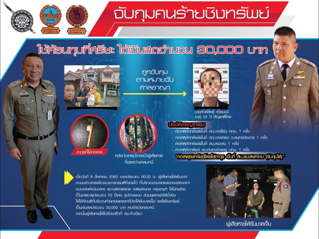 สืบเนื่องมาจากเมื่อวันที่ 8 สิงหาคม 2562 เวลาประมาณ 00.02 น. นางอัมพรพรรณ แดงอุไร อายุ 53 ปี ผู้เสียหายได้เดินจากถนนข้าวสารเพื่อจะมาเอารถยนต์ที่จอดไว้ ที่บริเวณลานจอดรถกองสลากฯเก่า ถนนราชดำเนินกลาง แขวงตลาดยอด เขตพระนคร กทม. ได้มีคนร้ายเป็นชายอายุประมาณ 50 ปีเศษ รูปร่างผอม สวมเสื้อชุดซาฟารีสีน้ำเงิน ได้ใช้ค้อนตีที่บริเวณท้ายทอยและชกที่ปากได้รับบาดเจ็บ โดยได้ชิงทรัพย์เป็นเงินสดประมาณ 30,000 บาท วิ่งหลบหนีไป จากนั้นผู้เสียหายได้ไปรักษาตัวที่ รพ.หัวเฉียว และร้องทุกข์กับพนักงานสอบสวนท้องที่ สน.ชนะสงคราม ตามคดีอาญาที่ 557/2562