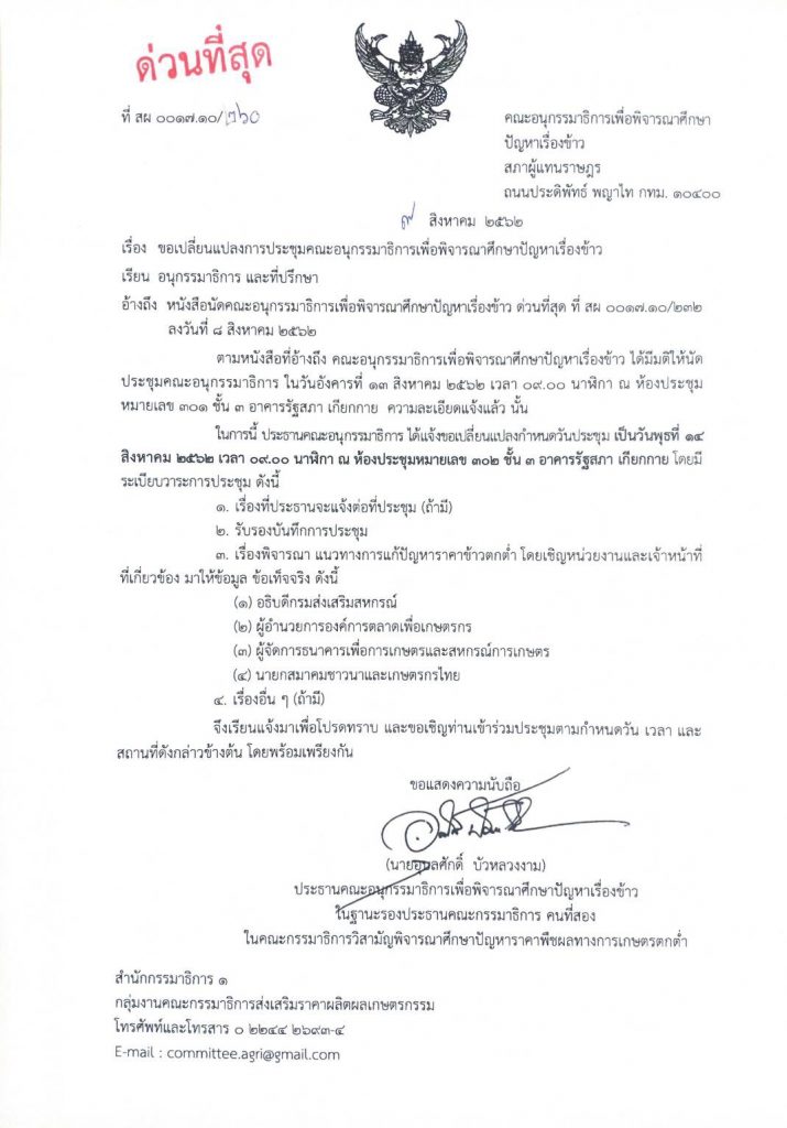 สมาคมชาวนา และเกษตรกรไทย กำหนดเรียกประชุมแกนนำด่วน เพื่อสรุปปัญหาให้รัฐบาลเร่งแก้ไขปัญหา และหาทางช่วยเหลือ โดยเฉพาะปัญหานาข้าวเสียหายเพราะปัญหาภัยแล้ง
