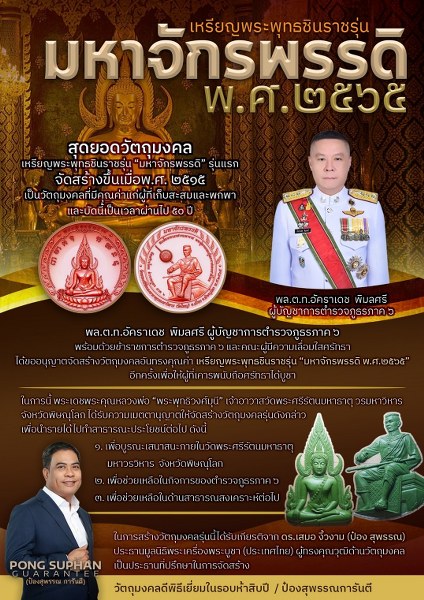 สุดยอดวัตถุมงคล เหรียญพระพุทธชินราชรุ่น “มหาจักรพรรดิ” รุ่นแรก จัดสร้างขึ้นเมื่อ พ.ศ.2515 เป็นวัตถุมงคลที่มีคุณค่าแก่ผู้ที่เก็บสะสมและพกพา และบัดนี้เป็นเวลาผ่านไป 50 ปี พล.ต.ท.อัคราเดช พิมลศรี ผู้บัญชาการตำรวจภูธรภาค 6 พร้อมด้วยข้าราชการตำรวจภูธรภาค 6 และคณะผู้มีความเลื่อมใสศรัทธาได้ขออนุญาตจัดสร้างวัตถุมงคลอันทรงคุณค่า เหรียญพระพุทธชินราชรุ่น “มหาจักรพรรดิ พ.ศ.2515” อีกครั้งเพื่อให้ผู้ที่เคารพนับถือศรัทธาได้บูชา