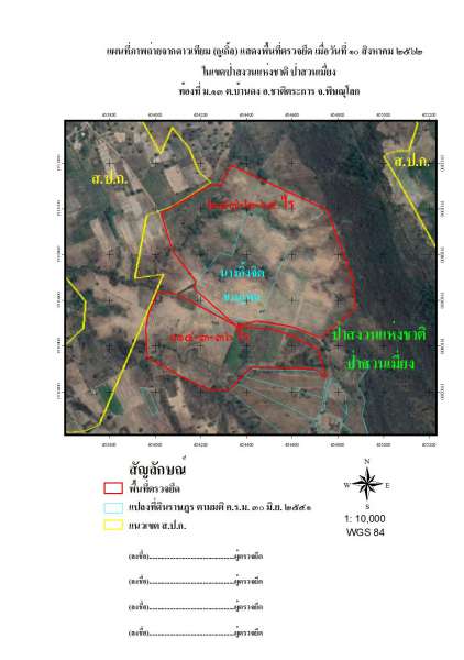 เมื่อเวลา 13.30 น.วันที่ 10 ส.ค.62 คณะเจ้าหน้าที่เข้าตรวจสอบบริเวณพื้นที่ป่าสงวนแห่งชาติ ป่าสวนเมี่ยง ซึ่งจากการสืบทราบ บริเวณดังกล่าวเป็นพื้นที่ป่าสงวนแห่งชาติ ป่าสวนเมี่ยง ท้องที่บ้านตีนตก หมู่ที่ 13 ต.บ้านดง อ.ชาติตระการ จ.พิษณุโลก มีกลุ่มนายทุนต่างถิ่นเข้ามากว้านซื้อที่ดินในเขตป่าสงวนฯ จำนวนหลายร้อยไร่ เพื่อทำการปลูกสวนยางพาราและปาล์มน้ำมัน คณะเจ้าหน้าที่เข้าตรวจสอบบริเวณพื้นที่เป้าหมายพบว่ามีการปลูกยางพารา (บางส่วนยืนต้นตาย) ปาล์มน้ำมัน, มันสำปะหลัง อ้อย และข้าวโพด เต็มพื้นที่ โดยพื้นที่อยู่ 2 ข้างทางสาย บ้านตีนตก-หนองขาหย่าง ซึ่งแบ่งพื้นที่เป็น 2 แปลง คณะเจ้าหน้าที่ได้ทำการตรวจสอบโดยใช้เครื่องมือตรวจวัดพิกัดจากสัญญาณดาวเทียม (GPS) (อ้างอิงหมุดหลักฐาน WGS 1984 Zone 47 ) หาค่าพิกัดของพื้นที่รอบแปลงที่ 1 มาคำนวณพื้นที่ได้ 257 – 2 – 64 ไร่ และแปลงที่ 2 คำนวณพื้นที่ได้ 114 – 3 – 36 ไร่ และเมื่อนำค่าพิกัดลงในแผนที่ภูมิประเทศ ปรากฏว่าอยู่ในเขตป่าสงวนแห่งชาติป่าสวนเมี่ยง ตรวจสอบผลการดำเนินงานตามมติ ค.ร.ม.30 มิถุนายน 2541 ปรากฏว่าบริเวณแปลงที่ 1 ตรวจสอบพบว่าทับซ้อนแปลงที่ดินของนางอิ้งจิต ชมพูพล ซึ่งได้สำรวจรังวัด และขึ้นทะเบียนไว้จำนวนเนื้อที่ 70 – 1 – 75 ไร่ แต่จากการตรวจสอบสภาพปัจจุบันปรากฏว่าสภาพพื้นที่จริงมีลักษณะบุกรุกขยายเพิ่มเติม และจากการสอบถามนายจรัญ คณะใน ซึ่งเป็นผู้ทำกินในพื้นที่ข้างเคียงให้ถ้อยคำว่านาง อิ้งจิตฯ ได้ขายที่ดินให้กับ “ไร่ไตรสุวรรณ“ แล้ว และบริเวณพื้นที่ตรวจสอบทั้ง 2 แปลงเป็นพื้นที่ของไร่ไตรสุวรรณ สอดคล้องกับคำให้การของนายอำนาจ สุวรรณเกาะ ผู้ใหญ่บ้านหมู่ที่ 13 ซึ่งให้ถ้อยคำในลักษณะเดียวกัน