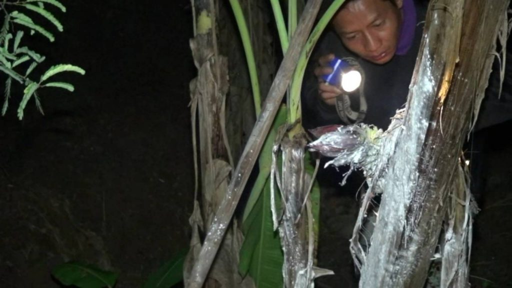เมื่อไปถึงพบกลุ่มชาวบ้านนับสิบ ต่างกำลังมุงดูต้นกล้วยประหลาด ขนาดความสูงราว 3 เมตร ซึ่งได้ปลูกไว้ปะปนกับกล้วยต้นอื่น ตามแนวสวนมะขามหวาน โดยกล้วยประหลาดต้นนี้ พบว่าช่วงบริเวณกลางลำต้น ได้มีปลีกล้วย แทงโผล่ออกมาจากลำต้น สูงจากพื้นดินราว 1.20 เมตร นับได้11หวี 135 ลูก สร้างความประหลาดใจแก่ผู้พบเห็นเป็นอย่างมาก จึงพากันนำดอกไม้ ธูปเทียน และขันธ์5 ประกอบพิธีบูชาตามความเชื่อ พร้อมใช้แป้งฝุ่นลูบเบา ๆ ไปที่โคนต้น ก่อนใช้แสงไฟส่องหาเลขเด็ด บางคนก็นำโทรศัพท์มือถือขึ้นมาถ่ายรูป หวังนำเลขเด็ดที่ได้ ไปเสี่ยงโชคกันต่อไป