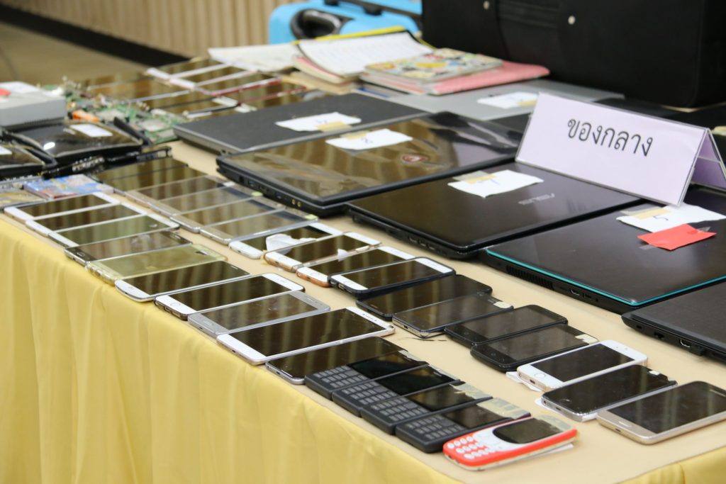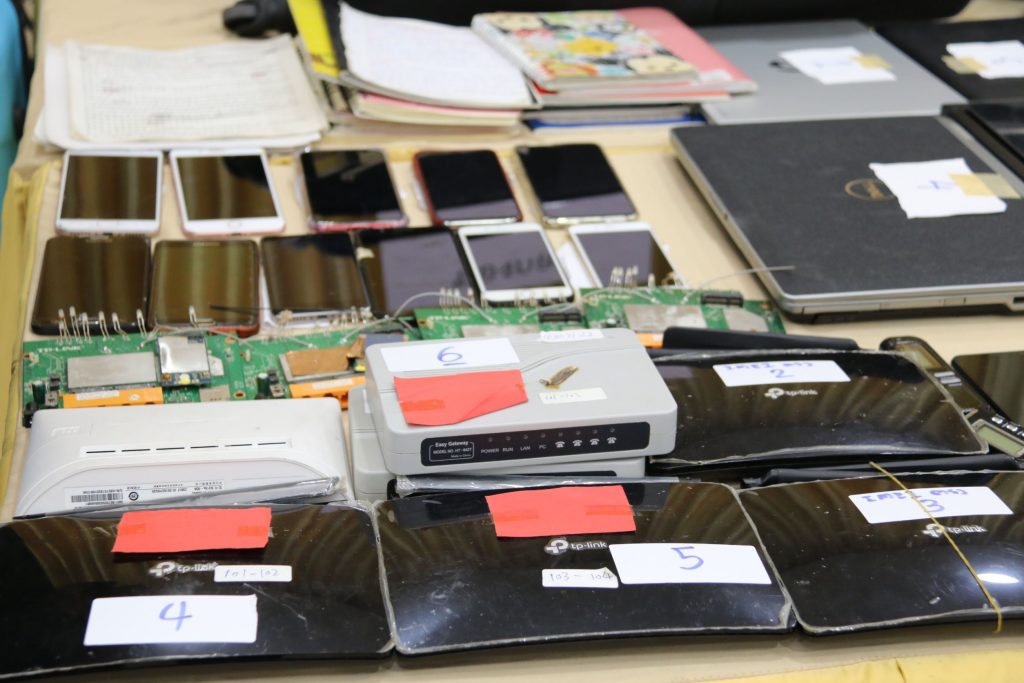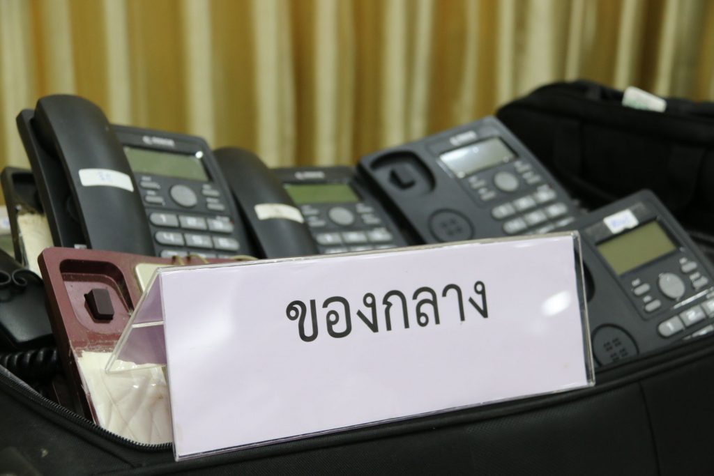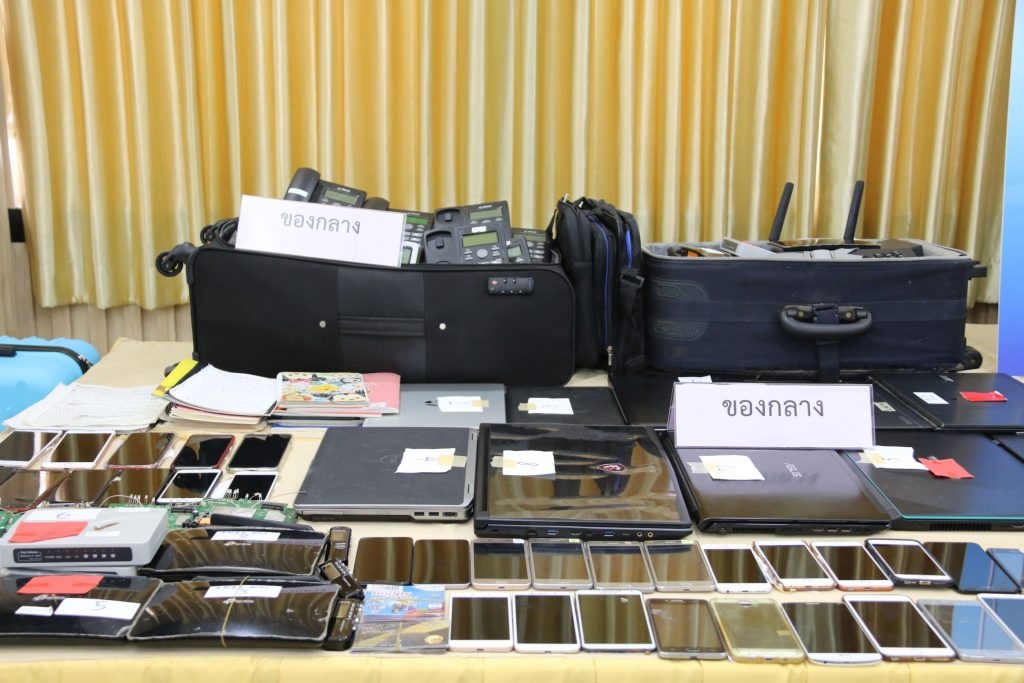 จากการตรวจสอบบ้านพักที่เป็นศูนย์โทรศัพท์ (Call Center) พบของกลางเป็นอุปกรณ์ที่ใช้ในการกระทำความผิดโดยการหลอกลวงผู้เสียหายชาวไต้หวัน เช่น โทรศัพท์มือถือ จำนวน 44 เครื่อง,คอมพิวเตอร์โน๊ตบุ๊ค จำนวน 10 เครื่อง,เครื่องปล่อยสัญญาณอินเตอร์เน็ต (เร้าเตอร์) จำนวน 17 เครื่อง,กล่อง Voip Gateway จำนวน 23 กล่อง,เครื่องโทรศัพท์บ้าน จำนวน 43 เครื่อง,ซิมการ์ดที่ยังไม่ได้ใช้งาน เครือข่าย Dtac จำนวน 5 ชิ้น,ซิมการ์ด Roaming ยี่ห้อ Blackberry จำนวน 4 ชิ้น,เครื่องบันทึกเสียงไม่ทราบยี่ห้อ จำนวน 3 เครื่อง,แผ่นกระดาษ และสมุดจดบันทึกเป็นภาษาจีน (สคริปต์บทสนทนาหลอกลวง) จำนวนมาก,หนังสือจิตวิทยาขั้นสูงในการก่ออาชญากรรม ฉบับภาษาจีน จำนวน 1 เล่ม และแฟลชไดร์ฟ จำนวน 3 ชิ้น