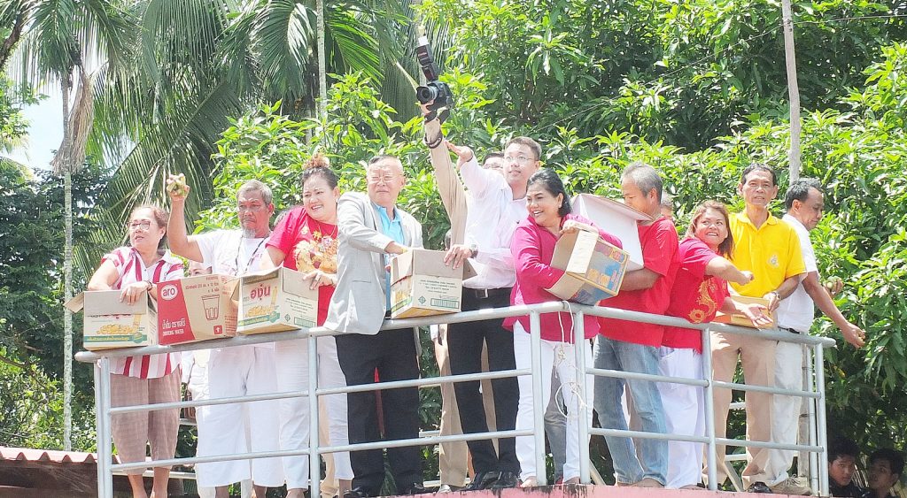 น.ท.สมบัติ บุญเกิดพานิช ประธานคณะกรรมการ “ศาลเจ้าแม่ทับทิม” หรือศาลเจ้าเกาะช้าง องค์ก๋ง 108 เปิดเผยว่า ข้าวสารพร้อมเครื่องอุปโภคบริโภค ที่นำมาแจกทานในครั้งนี้ได้รับการบริจาค จากผู้ใจบุญ เจ้าของสถานประกอบการ ที่บริจาคเป็นเงินสด ก็จะนำไปซื้อสิ่งของ นำรวมกันเป็นชุดแบบเท่าๆกัน เพื่อนำไปแจกทาน ซึ่งการจัดงานในแต่ปี จะมีประชาชนผู้ด้อยโอกาส ผู้ที่มีฐานะยากจน ที่อาศัยอยู่ในพื้นที่ หมู่บ้านใกล้เคียง มารอรับสิ่งของจำนวนมาก ในปีนี้ได้เตรียมสิ่งของแจกทานไว้มากกว่า 1,000 ชุด สิ่งของที่แจกประกอบด้วย ข้าวสาร น้ำมันพืช น้ำปลา ปลากระป๋อง บะหมี่กึ่งสำเร็จรูป ผงซักฟอก น้ำยาซักผ้า แฟซ่า สบู่