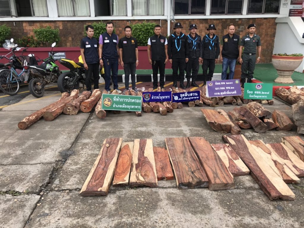 ตำรวจภูธรเมืองมุกดาหาร ปล่อยแถวกวาดล้างขบวนการลักลอบค้าไม้พะยูงข้ามชาติร่วมตำรวจตรวจคนเข้าเมือง ตม.และทหารพราน ออกไล่สกัดจับรถกระลักลอบขนไม้พะยูง มาจากต่างจังหวัดส่งนายทุนแนวชายแดนริมฝั่งโขงเครือข่ายขบวนการค้าไม้พะยูงข้ามชาติตามแนวชายแดน ลำเลียงข้ามโขงส่งขายประเทศเพื่อนบ้านร่วมไล่ติดตามสกัดรถขนไม้พะยูงคนขับเข้าไปจอดภายในบ้านหลังหนึ่งก่อนทิ้งรถพร้อมไม้พะยูงบรรทุกมาจำนวน 63 ท่อนหลบหนี