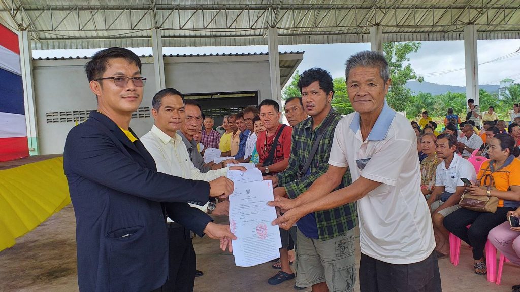 วันที่ 22 สิงหาคม 2562 ที่ศาลาอเนกประสงค์หมู่บ้านคลองจาก หมู่ 9 บ้านร่มเย็น ชาวบ้านหมู่ 8-9 บ้านคลองจาก ต.คลองใหญ่ อ.คลองใหญ่ จ.ตราด ชาวบ้านดีใจบ้านริมนํ้าถูกกฎหมาย จํานวน 294 ครัวเรือน ครั้งที่ 1/2562