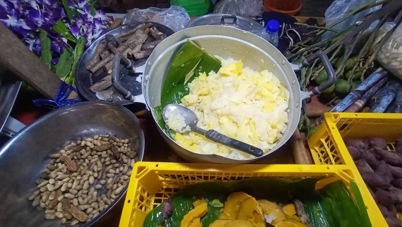 - ข้าวเหนียว เนื้อปลา เนื้อไก่ หมู และใส่ลงไปอย่างละเล็กอย่างละน้อยถือเป็นอาหารคาว