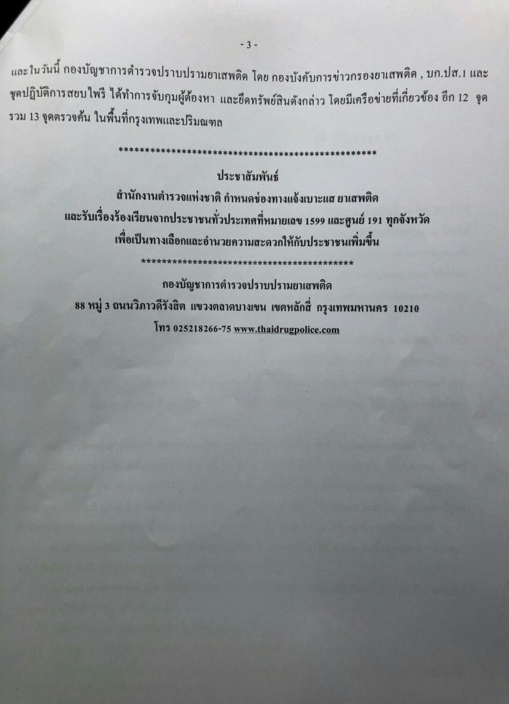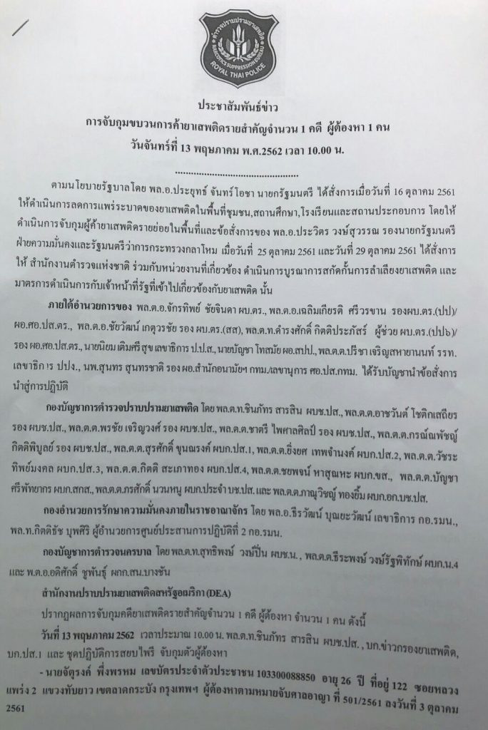 สืบเนื่องเมื่อวันจันทร์ที่ 13 พฤษภาคม 2562 เวลา 10:00 น. พลโท กิตติธัช บุพศิริ ผู้อำนวยการศูนย์การประสานการปฏิบัติที่ 2 กอ.รมน. พร้อมด้วย พล.ต.อ. เฉลิมเกียรติ ศรีวรขาน รองผู้บัญชาการตำรวจแห่งชาติ/ผู้อำนวยการศูนย์อำนวยการป้องกันและปราบปรามยาเสพติด และ หน่วยงานที่เกี่ยวข้อง ร่วมกันแถลงข่าว จับกุมเครือข่ายนักค้ายาเสพติดรายสำคัญ ณ. กองบัญชาการตำรวจปราบปรามยาเสพติด (บช.ปส.) ถนนวิภาวดีรังสิต กรุงเทพฯ