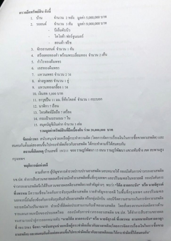 ทั้งนี้ผู้ต้องดังกล่าวชื่อ นายจตุรงค์ พึ่งพรหม หรือ “โต๊ด ลาดกระบัง” โดยเจ้าหน้าที่ได้ทำการสืบสวนหาเบาะเเสะผู้ต้องหารายนี้จนสามารถตามมาจับกุมได้ที่ บ้านเลขที่ 19/211 ถนนราษฎร์พัฒนา เขตสะพานสูง กทม. และ สามารถตามยึดทรัพย์ ที่เกี่ยวข้องกับยาเสพติด ได้หลายรายการ อาทิ บ้านพัก 2 หลัง, รถยนต์ 3 คัน และ สร้อยคอทองคำ , เครื่องประดับ ราคาแพง , อีกหลายรายการ รวมมูลค่าทั้งหมดประมาณ 20 ล้านบาท