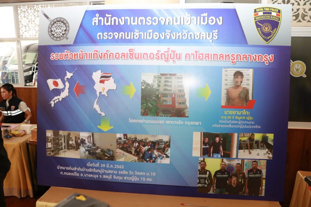 พล.ต.ท.สมพงษ์ฯ กล่าวว่า สืบเนื่องจากการจับกุมเมื่อวันที่ 29 มี.ค.62 สตม.โดย กก.สส.บก.ตม.3 และตม.จ.ชลบุรี นำหมายค้นศาลแขวงพัทยาที่ 5/2562 ลงวันที่ 29 มี.ค.62 เข้าตรวจค้นบ้านเลขที่ 78/219 หมู่บ้านสยาม รอยัล วิว วิลเลจ ม.10 ต.หนองปรือ อ.บางละมุง จ.ชลบุรี จนสามารถจับกุมชาวญี่ปุ่น จำนวน 15 ราย ซึ่งทำการโทรศัพท์เพื่อหลอกลวงไปยังประเทศญี่ปุ่น จนมีผู้เสียหายกว่า 500 ราย คิดเป็นมูลค่าความเสียหายถึง 89 ล้านเยน หรือคิดเป็นเงินไทย ประมาณ 25 ล้านบาท อันเป็นกรณีที่ทางการญี่ปุ่นให้ความสำคัญและสนใจเป็นอย่างยิ่ง เนื่องจากมีผู้เสียหายจำนวนมากอีกทั้งยังไม่เคยมีการจับกุมผู้กระทำความผิดได้มาก่อน