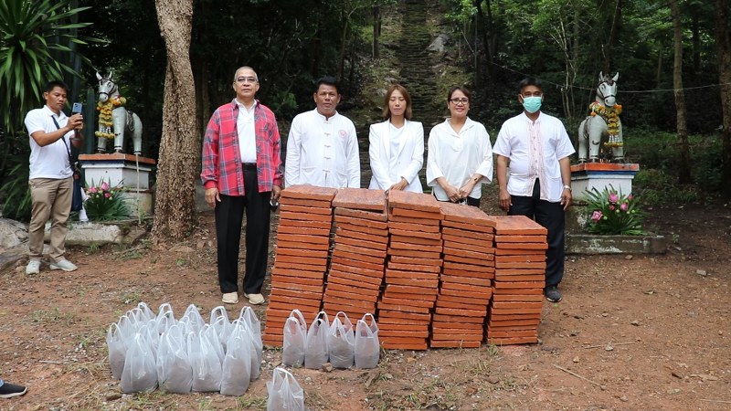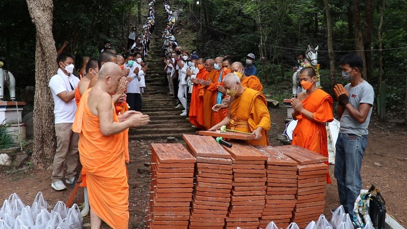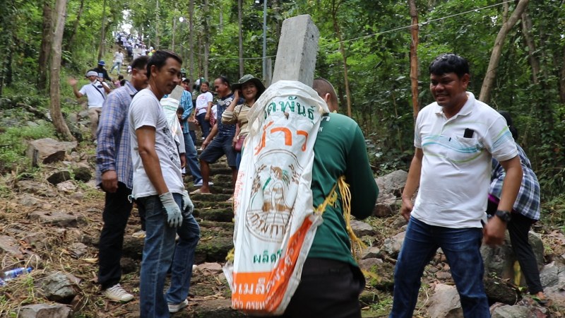 โดยอาศัยผู้ชายที่มีร่างกายกำยำแข็งแรง ช่วยแบกเสาปูนแท่ง ขนาดความกว้าง 4 นิ้ว หนา 4 นิ้ว สูง 1 เมตร จำนวน 200 ต้น ใส่ถุงปุ๋ยแบกขึ้นไป เป็นส่วนหนึ่งของการปูพื้นทางเดินรอบเจดีย์และวิหาร ยาวประมาณ 300 เมตร ปรับภูมิทัศน์พื้นที่บนเขาบันไดม้า ให้มีความสวยงามเหมาะสมที่จะเป็นแหล่งท่องเที่ยวเชิงประวัติ ศาสตร์ทางโบราณคดี และใช้ในการประกอบพิธีทางศาสนา ผนึกกำลังแรงศรัทธาด้วยการใช้หยาดเหงื่อจากแรงกายแรงใจบริจาคเป็นแรงงาน สร้างบุญอันยิ่งใหญ่ในครั้งนี้ ให้เสร็จสมบูรณ์ตามที่ตั้งใจไว้