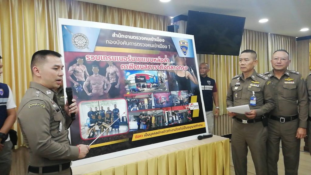 เจ้าหน้าที่ชุดจับกุมฯ ยังสืบทราบอีกว่าเทรนเนอร์ชาวต่างชาติบางรายทำงานโดยไม่มีใบอนุญาตทำงาน จึงได้รวบรวมข้อมูลและแฝงตัวเข้าไปตรวจสอบ จนทราบแน่ชัดว่ามีการจ้างคนต่างชาติทำงานโดยไม่มีใบอนุญาตทำงานจริง จากนั้นเจ้าหน้าที่ได้นำกำลังเข้าตรวจสอบและจับกุม ขณะเข้าตรวจสอบพบผู้ใช้บริการจำนวนหนึ่ง ซึ่งมีดารา นักแสดงที่มีชื่อเสียงมาใช้บริการรวมอยู่ด้วย ในส่วนของพนักงาน นอกจากพนักงานคนไทยแล้วยังพบผู้ถูกจับทั้ง 3 ราย ซึ่งเป็นคนต่างชาติ กำลังทำงานอยู่โดยทำหน้าที่เป็นเทรนเนอร์ฝึกสอนแนะนำควบคุมการออกกำลังกายให้กับผู้มาใช้บริการ จากการตรวจสอบชาวต่างชาติทั้ง 3 ราย ชื่อ MR.CHRISTOPHER อายุ 26 ปี สัญชาติ ฝรั่งเศส MR.GABOR อายุ 28 ปี สัญชาติ ฮังการี และ MR.CIRO อายุ 33 ปี สัญชาติ อิตาลี ได้รับอนุญาตให้อยู่ในราชอาณาจักรชั่วคราวโดยถูกต้องตามกฎหมาย แต่ไม่มีเอกสารแสดงการได้รับอนุญาตทำงาน