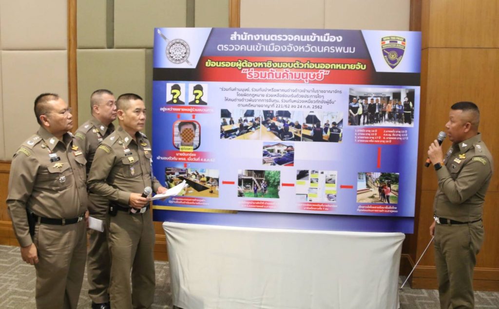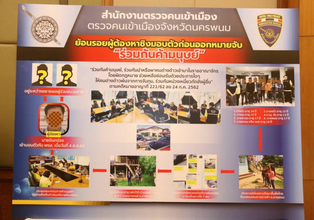 ตม.จ.นครพนม ได้รับการประสานจากฝ่ายปกครอง อ.ธาตุพนม จ.นครพนม ว่ามีเด็กชาวลาว 7 คนถูกหน่วงเหนี่ยวกักขังได้หลบหนีออกมาขอความช่วยเหลือจากชาวบ้าน จึงได้ประสานเจ้าหน้าที่ผู้เกี่ยวข้องทำการสัมภาษณ์คัดแยกเหยื่อจากการค้ามนุษย์ หลังจากได้ข้อมูลการคัดแยกเหยื่อ และการสืบสวนขยายผล ตามคำให้การของผู้เสียหาย จึงทราบว่าผู้กระทำความผิดประกอบด้วย นางแก้ว ไม่ทราบชื่อจริงนามสกุลจริง สัญชาติลาว อายุประมาณ 60 ปี เป็นผู้นำพาผู้เสียหายทั้ง 7 ราย จากฝั่ง สปป.ลาว มาส่งให้กับชายไทยไม่ทราบชื่อ ที่บริเวณจุดผ่อนปรนทางการค้าชายแดน อ.ธาตุพนม จ.นครพนม