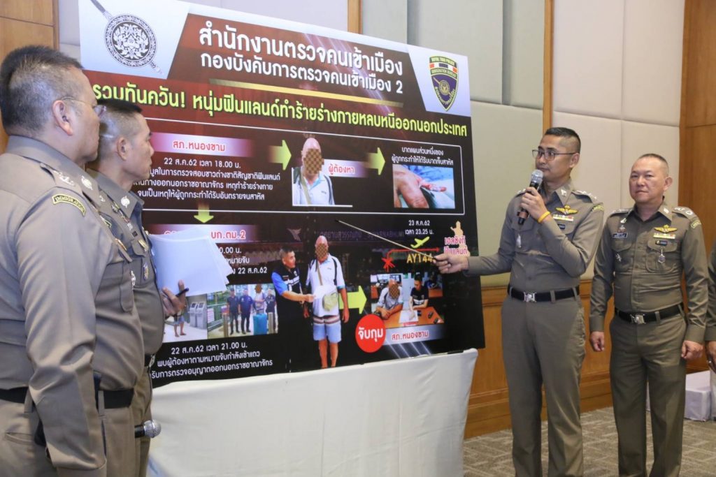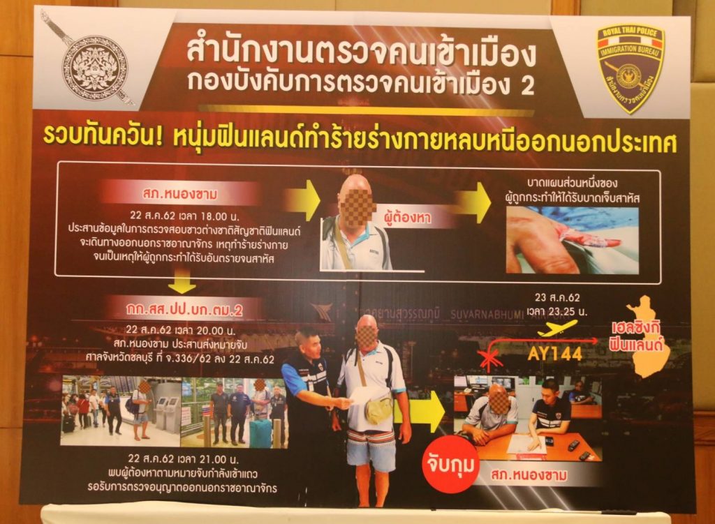 รายที่ 2 เมื่อวันที่ 23 ส.ค.62 เวลาประมาณ 07.40 น. จับกุมชาวฟินแลนด์ ทำร้ายร่างกายหญิงไทย ขณะกำลังลักลอบหนีออกประเทศ ผู้เสียหายไปแจ้งความดำเนินคดี ในข้อหา “ทำร้ายร่างกายผู้อื่นเป็นเหตุให้ได้รับอันตรายสาหัส” และมีหมายศาลลงวันที่ 22 ส.ค.62 นำส่ง สภ.หนองขาม จว.ชลบุรี เพื่อดำเนินคดีตามกฎหมายต่อไป
