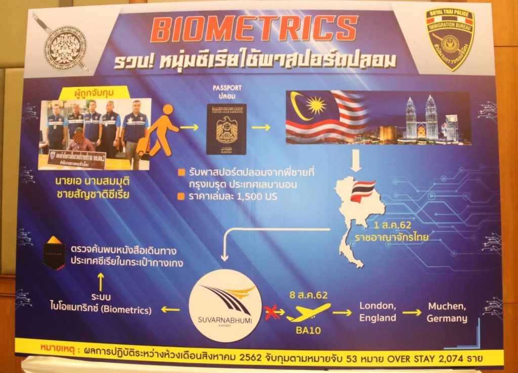 รายที่ 1 เมื่อวันที่ 8 ส.ค.62 เวลาประมาณ 12.00 น. จับกุมหนุ่มซีเรีย อายุประมาณ 18 ปี ใช้หนังสือเดินทางประเทศสหรัฐอาหรับเอมิเรต์สปลอม เพื่อใช้ในการเดินทางไปขอลี้ภัยที่ประเทศอังกฤษ โดยหนุ่มซีเรียอ้างว่า รับหนังสือเดินทางทางไปรษณืย์ เมืองเบรุต ประเทศเลบานอน ราคาประมาณ 1,500 เหรียญสหรัฐ ก่อนจะเดินทางมาประเทศไทยเพื่อใช้หนังสือเดินทางปลอมเล่มดังกล่าวในการเดินทาง จึงถูกจับกุมในข้อหา “ใช้หรือมีไว้ใช้ซึ่งหนังสือเดินทางปลอมฯ (หนังสือเดินทางประเทศสหรัฐอาหรับเอมิเรตส์ปลอม)” นำส่ง พงส.สภ.ท่าอากาศยานสุวรรณภูมิ เพื่อดำเนินคดีตามกฎหมายต่อไป