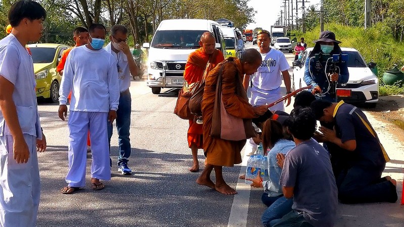 วันที่ 19 พ.ย. 65 ที่โรงเรียนบ้านดงไม้งาม ตำบลชัยเกษม อำเภอบางสะพาน จังหวัดประจวบคีรีขันธ์ หลวงตาบุญชื่น ปัญญาวุฑโท อายุ 74 ปี 13 พรรษา ซึ่งเป็นพระธุดงค์สายป่า แห่งที่พักสงฆ์หลวงตาบุญชื่น ต.โพนสวรรค์ อ.โพนสวรรค์ จ.นครพนม และเป็นที่เคารพของสาธุชนทั่วประเทศ เริ่มออกเดินจาริกธุดงค์เท้าเปล่าแสวงบุญโปรดญาติโยมและมุ่งการให้ทานแล้ว ท่ามกลางแสงแดดจร้าตั้งแต่เช้า โดยวันนี้ เริ่มออกเดินจากโรงเรียนบ้านดงไม้งาม ปลายทางวัดห้วยลึก อ.ทับสะแก ระยะทางประมาณ 23 กิโลเมตร