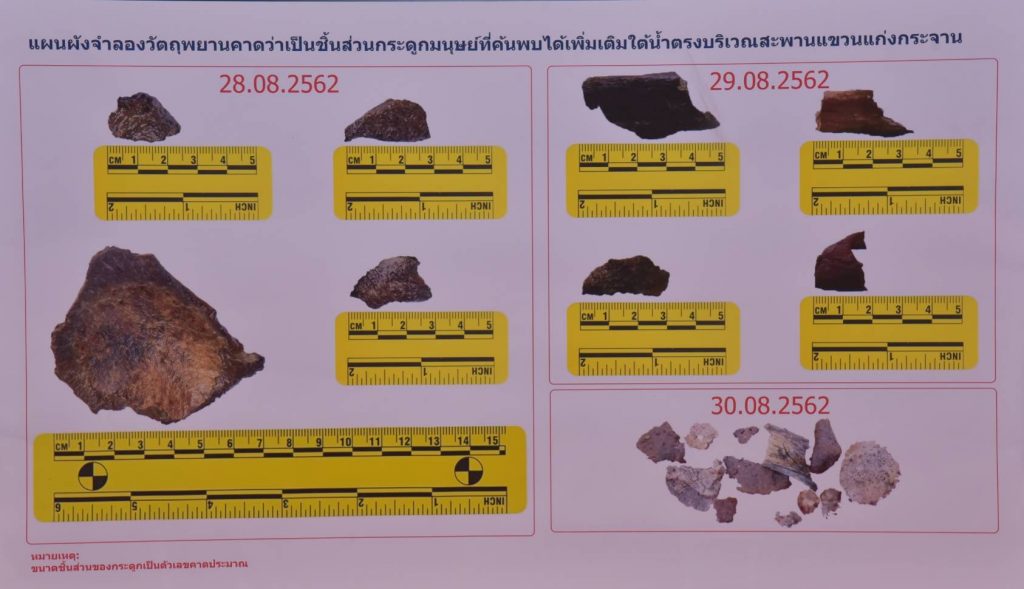 นอกจากนี้ เมื่อวันที่ 28-30 สิงหาคม 2562 พนักงานสอบสวนคดีพิเศษ ได้ร่วมกับ นักประดาน้ำ จากกองบังคับการสนับสนุนทางอากาศ กองบัญชาการตำรวจตระเวนชายแดน และกองบัญชาการตำรวจภูธรภาค 7 ตรวจหาพยานหลักฐานที่พื้นที่ใต้น้ำบริเวณสะพานแขวน เขื่อนแก่งกระจาน ตรวจหาพยานหลักฐาน พบชิ้นส่วนกระดูกเพิ่มเติมอีกจำนวน 20 ชิ้น ซึ่งอยู่ในระหว่างการดำเนินการ