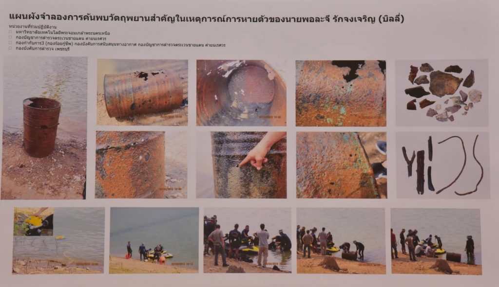 กระทั่งเมื่อวันที่ 26 เมษายน 2562 และเมื่อวันที่ 22-24 พฤษภาคม 2562 พนักงานสอบสวนคดีพิเศษได้ใช้เครื่องยานยนต์สำรวจใต้น้ำจากคณะวิศวกรรมศาสตร์ มหาวิทยาลัยเทคโนโลยีพระจอมเกล้าพระนครเหนือ และนักประดาน้ำ จากกองบังคับการสนับสนุนทางอากาศ กองบัญชาการตำรวจตระเวนชายแดน ตรวจหาพยานหลักฐานที่พื้นที่ใต้น้ำบริเวณสะพานแขวน เขื่อนแก่งกระจาน สามารถตรวจพบชิ้นส่วนกระดูก จำนวน 2 ชิ้น ถังน้ำมันขนาด 200 ลิตร จำนวน 1 ถัง เหล็กเส้น จำนวน 2 เส้น ถ่านไม้ จำนวน 4 ชิ้น และเศษฝาถังน้ำมัน