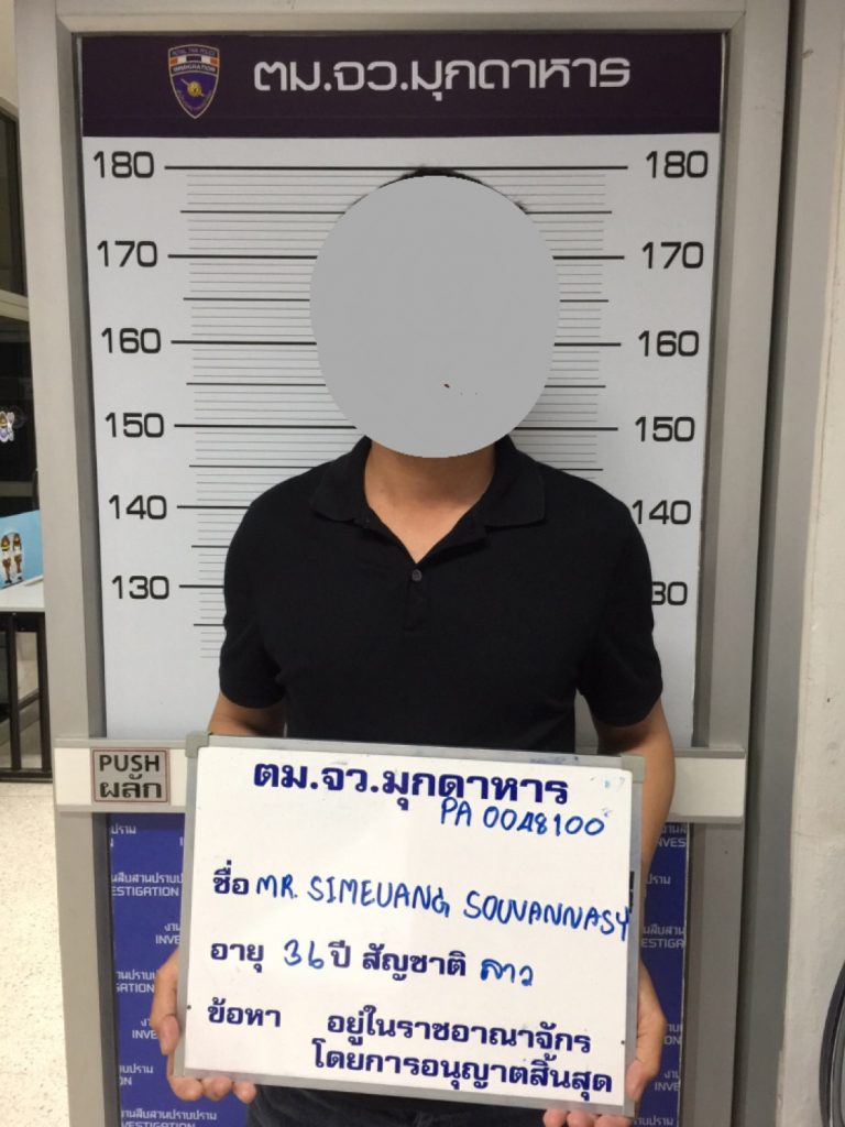 พฤติการณ์ในการจับกุม ตามวันและเวลาที่เกิดเหตุ เจ้าหน้าที่ชุดจับกุมได้ออกตรวจพื้นที่รับผิดชอบบริเวณสถานีขนส่งผู้โดยสารจังหวัดมุกดาหาร ได้ตรวจพบ MR.SIMEUANG SOUVANNASY อายุ 36 ปี สัญชาติ ลาว (ทราบชื่อ-สกุล อายุ และสัญชาติภายหลัง) มีรูปร่างลักษณะมีพิรุธคล้ายคนต่างด้าว จึงได้แสดงตัวเป็นพนักงานเจ้าหน้าที่ตรวจคนเข้าเมือง และขอตรวจสอบเอกสารประจำตัว ผู้ถูกจับได้ยื่นเอกสารใช้แทนหนังสือเดินทาง (LAISSEZ-PASSER) แสดงตนว่าเป็นบุคคลสัญชาติลาว แต่ไม่มีรอยตราประทับของพนักงานเจ้าหน้าที่ตรวจคนเข้าเมืองอนุญาตให้อยู่ในราชอาณาจักรแต่อย่างใด เจ้าหน้าที่จึงสอบถามว่ามีหนังสือเดินทางหรือไม่ ผู้ถูกจับแจ้งว่าเก็บไว้ในกระเป๋าสะพายสีดำและได้นำหนังสือเดินทางเลขที่ P 2011828 มาแสดงกับเจ้าหน้าที่ จากการตรวจสอบหนังสือเดินทางพบว่า ผู้ถูกจับได้เดินทางเข้ามาในราชอาณาจักรครั้งล่าสุด เมื่อวันที่ 19 พฤษภาคม 2561 ( 19 MAY 2018 )โดยได้รับการตรวจลงตราประเภท ผ.ผ.30 ได้รับอนุญาตให้อยู่ในราชอาณาจักรถึงวันที่ 17 มิถุนายน 2561 ( 17 JUN 2018) แต่ผู้ถูกจับได้อยู่ในราชอาณาจักรมาโดยตลอดจนถึงปัจจุบัน เจ้าหน้าที่จึงได้แจ้งให้ทราบว่าการกระทำดังกล่าวเป็นความผิดข้อหา “อยู่ในราชอาณาจักรโดยการอนุญาตสิ้นสุด” ตามพระราชบัญญัติคนเข้าเมือง พ.ศ.2522 จึงทำการจับกุมและนำตัวผู้ต้องหาส่งพนักงานสอบสวน สภ.เมืองมุกดาหาร ดำเนินคดีตามกฎมายต่อไป