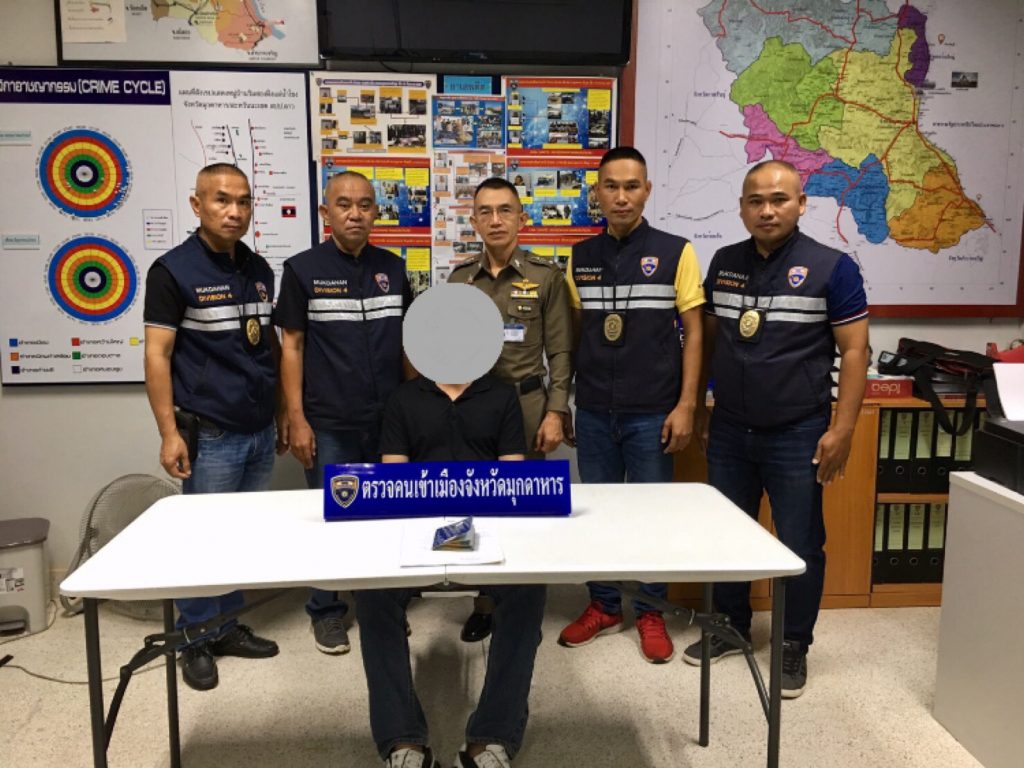 เมื่อวันนี้ 3 กันยายน 2562 เวลา 08.00 น.ตรวจคนเข้าเมืองมุกดาหาร ภายใต้อำนวยการสั่งการของพ.ต.อ.ชนะพณ สุวรรณศรีนนท์ ผกก.ตม.จว.มุกดาหาร บก.ตม.4, พ.ต.ท.ธีรวัฒน์ ทิพย์ธนาวิวัฒ รอง ผกก.ตม.จว.มุกดาหาร บก.ตม.4 และ พ.ต.ท.ยศพร มาศรีนวล สว.ตม.จว.มุกดาหาร บก.ตม.4 ชุดจับกุมโดย ว่าที่ ร.ต.ต.จิรภัทร อินทะเนน รอง สว.ตม.จว.มุกดาหาร, ด.ต.กฤษกร ชุ่มวงศา, ด.ต.สมบัติ แก้วพวง, ด.ต.กานตพงศ์ บุดดีวัน และ ด.ต.ยุทธพล เศษสุวรรณ ผบ.หมู่ ตม.จว.มุกดาหาร ได้ทำการจับกุม MR.SIMEUANG SOUVANNASY อายุ 36 ปี สัญชาติ ลาว ถือหนังสือเดินทางเลขที่ PA 0048100 ข้อหา “เป็นคนต่างด้าวอยู่ในราชอาณาจักรโดยการอนุญาตสิ้นสุด”สถานที่จับกุม บริเวณสถานีขนส่งผู้โดยสารจังหวัดมุกดาหาร ต.มุกดาหาร อ.เมืองมุกดาหาร จ.มุกดาหาร
